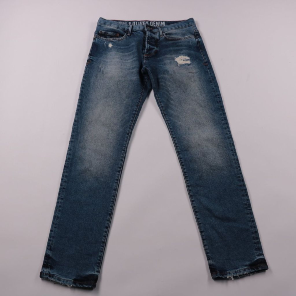 Мужские джинсы S.Oliver Denim синего цвета с лёгкими потертостями и декоративными разрывами. Подойдут для повседневной носки и casual-образов в любое время года. Эластан в составе даёт небольшую эластичность и более комфортную посадку.