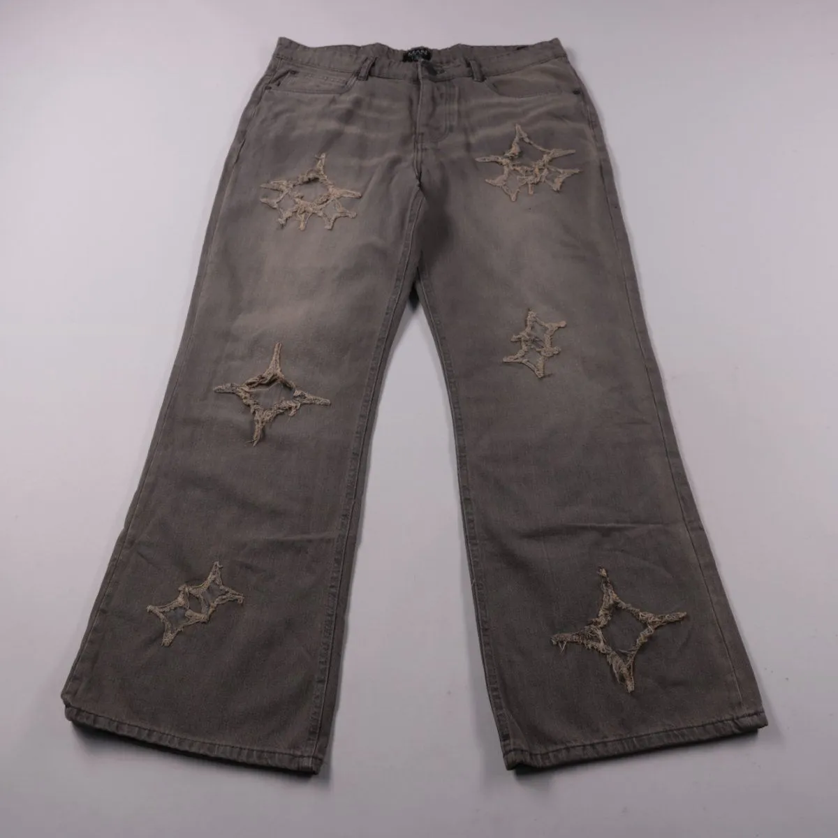 Мужские серые джинсы boohooMAN из денима с декоративными нашивками/аппликациями в виде звёзд. Подойдут для повседневных образов и уличного стиля. Плотная ткань и классические 5 карманов делают их практичными в носке.