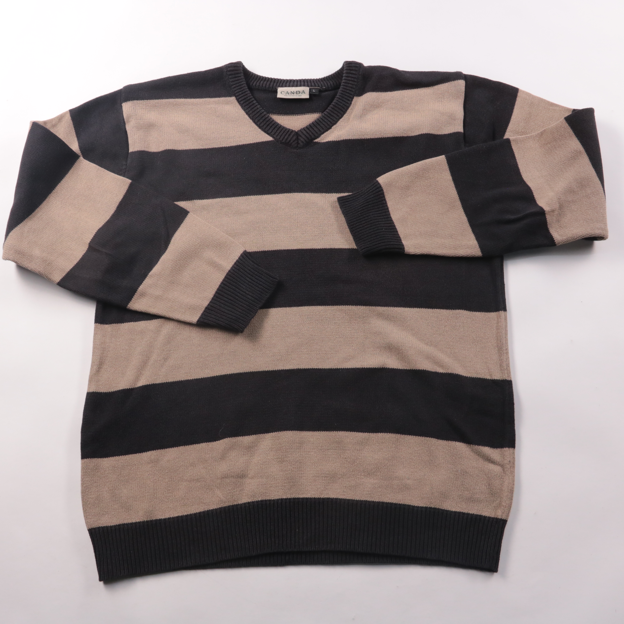 Мужской свитер Canda в широкую полоску с V-образным вырезом и манжетами на резинке. Подойдёт для повседневной носки в прохладную погоду, хорошо сочетается с джинсами и чиносами. Натуральный хлопок приятен к телу и прост в уходе.