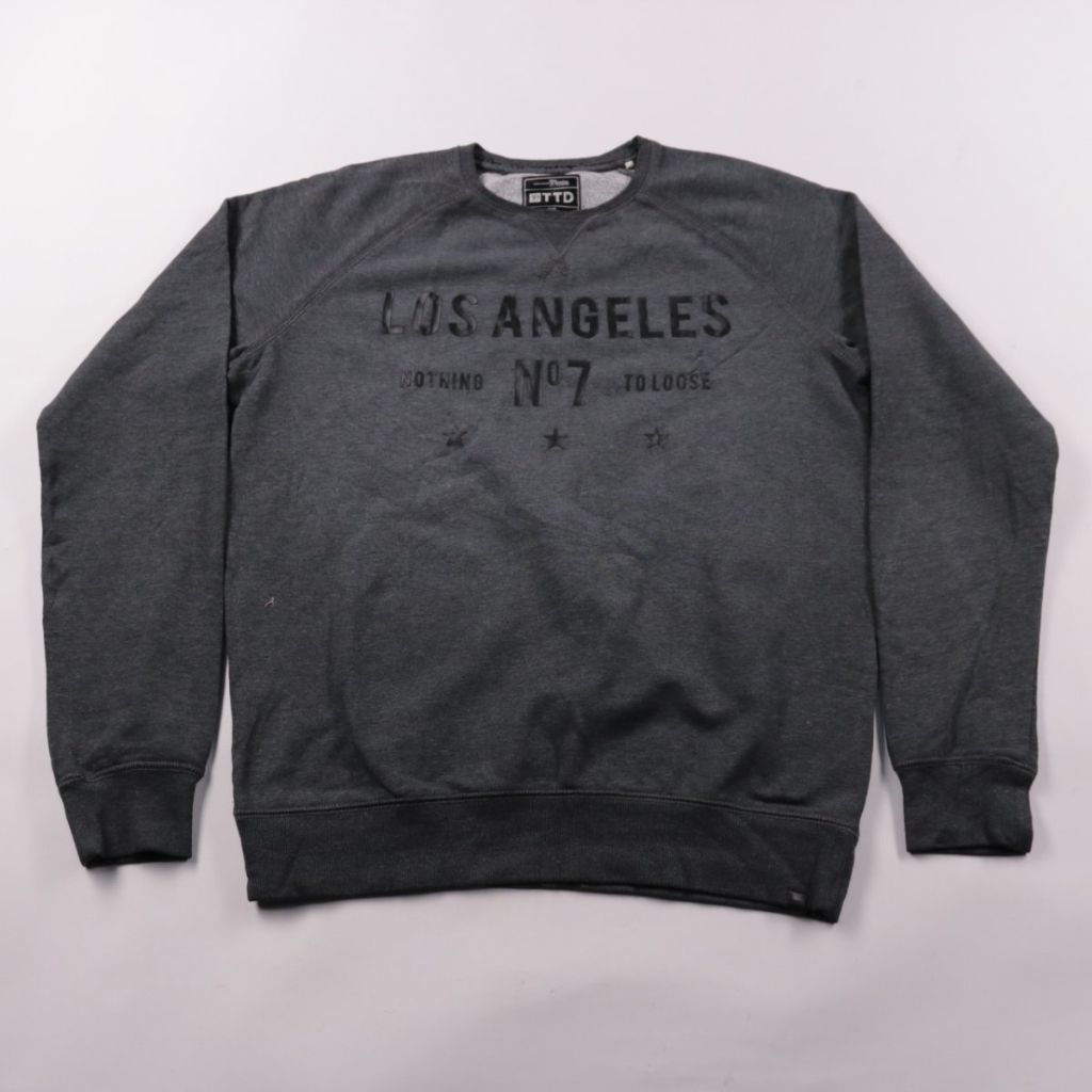 Мужской свитшот Tom Tailor Denim тёмно-серого цвета с фактурным принтом «Los Angeles №7». Подойдёт для повседневной носки и как второй слой в прохладную погоду. Смесь хлопка с полиэстером практична в уходе и держит форму.