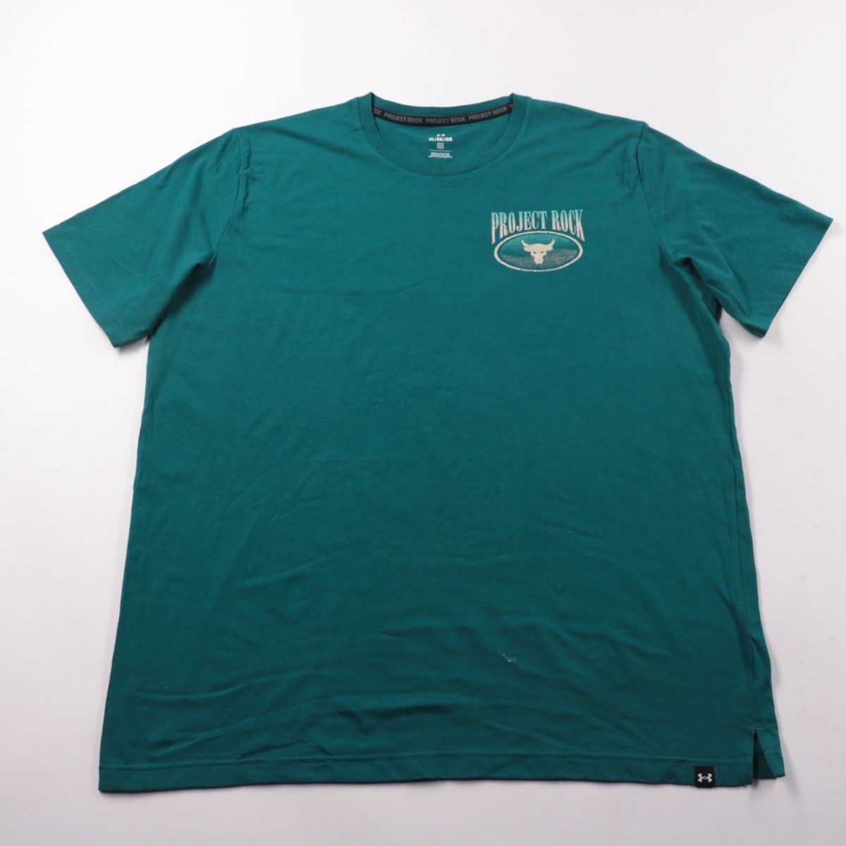 Мужская футболка Under Armour из линейки Project Rock, цвет бирюзово-зелёный, с принтом/логотипом спереди и крупным принтом на спине. Подойдёт для тренировок и повседневной носки в тёплую погоду. Свободный крой (Loose) не стесняет движений.