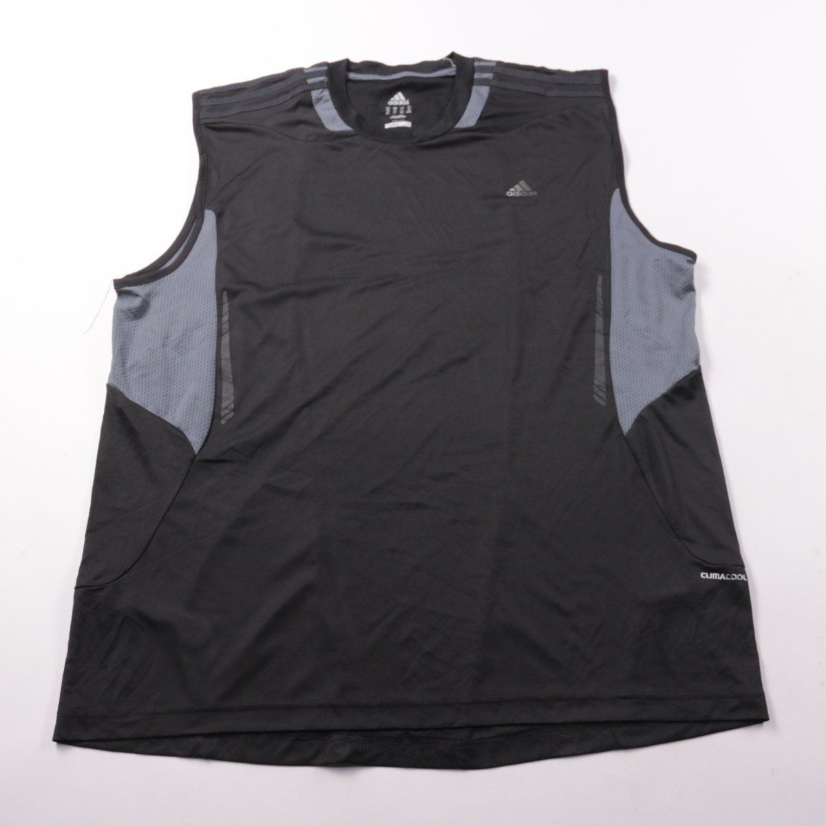 Мужская спортивная майка Adidas ClimaCool, чёрная с серыми сетчатыми вставками по бокам. Подойдёт для тренировок, бега и зала в тёплую погоду благодаря вентиляции. Быстро сохнет и хорошо отводит влагу.