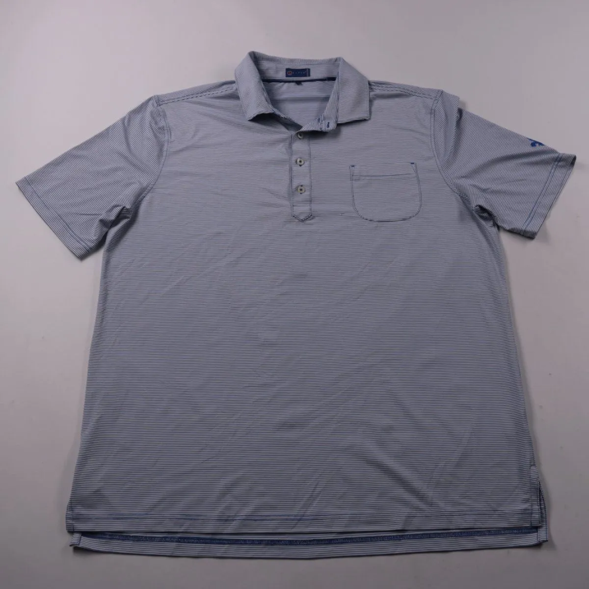 Мужское поло Stitch в тонкую голубую полоску, с отложным воротником и планкой на пуговицах. Подойдёт для повседневной носки и спорта (гольф/активный отдых). Ткань с добавлением спандекса тянется и быстро сохнет.
