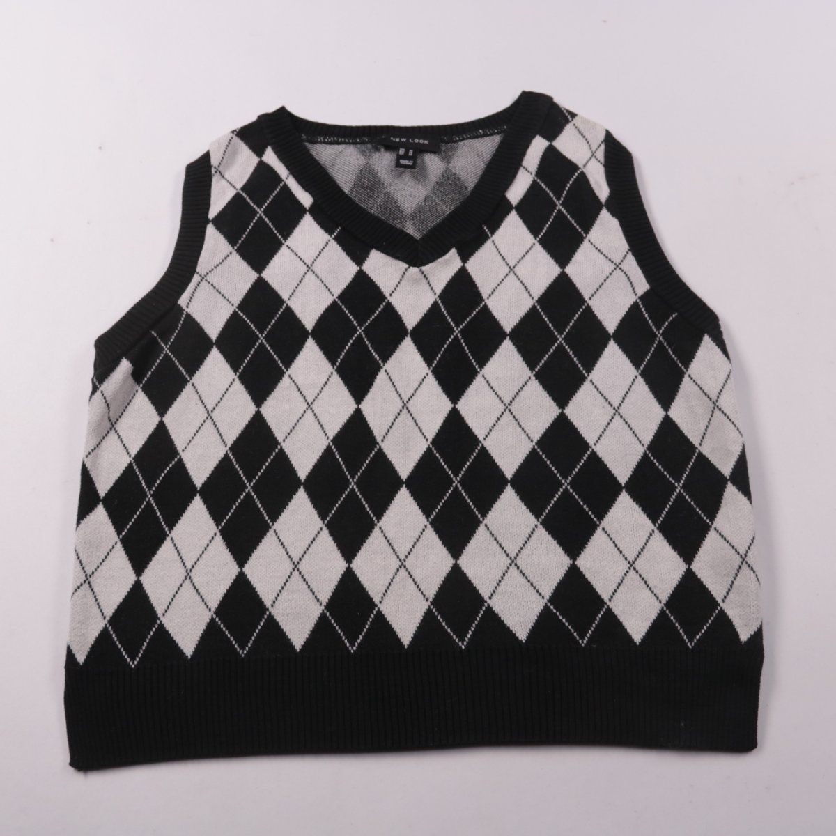 Трикотажный жилет New Look с V-образным вырезом и узором аргайл в чёрно-белой гамме. Подойдёт для офисных и повседневных образов поверх рубашки или лонгслива. Практичен как дополнительный слой: удобно носить под курткой и легко комбинировать с базовыми вещами.