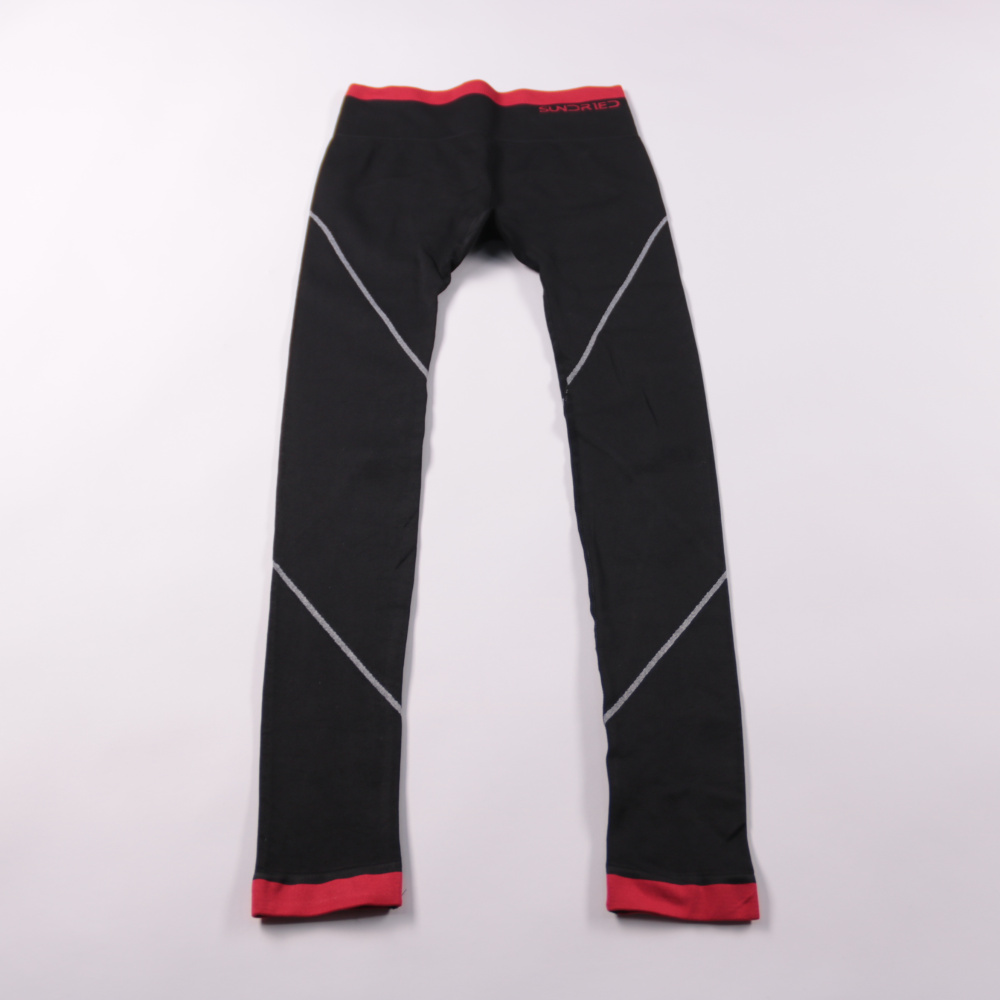 Мужские термоштаны/леггинсы Sundried в чёрном цвете с красными манжетами и плоскими швами. Подойдут для бега, велотренировок и как нижний слой в прохладную погоду. Эластичный материал хорошо тянется и быстро сохнет.