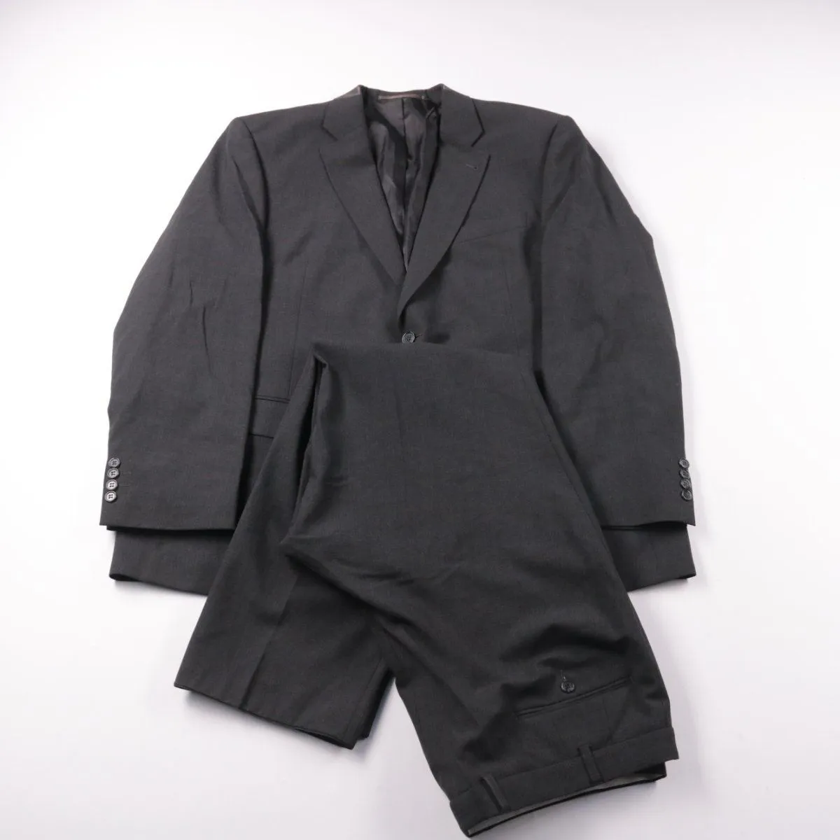 Мужской классический костюм (пиджак и брюки) тёмно-серого/графитового цвета, подойдёт для офиса, деловых встреч и торжественных мероприятий. По бирке верх: 60% шерсть virgin wool, 38% полиэстер, 2% эластан; подкладка 100% полиэстер. Ткань практичная и почти не мнётся, благодаря добавлению эластана костюм комфортнее в носке.