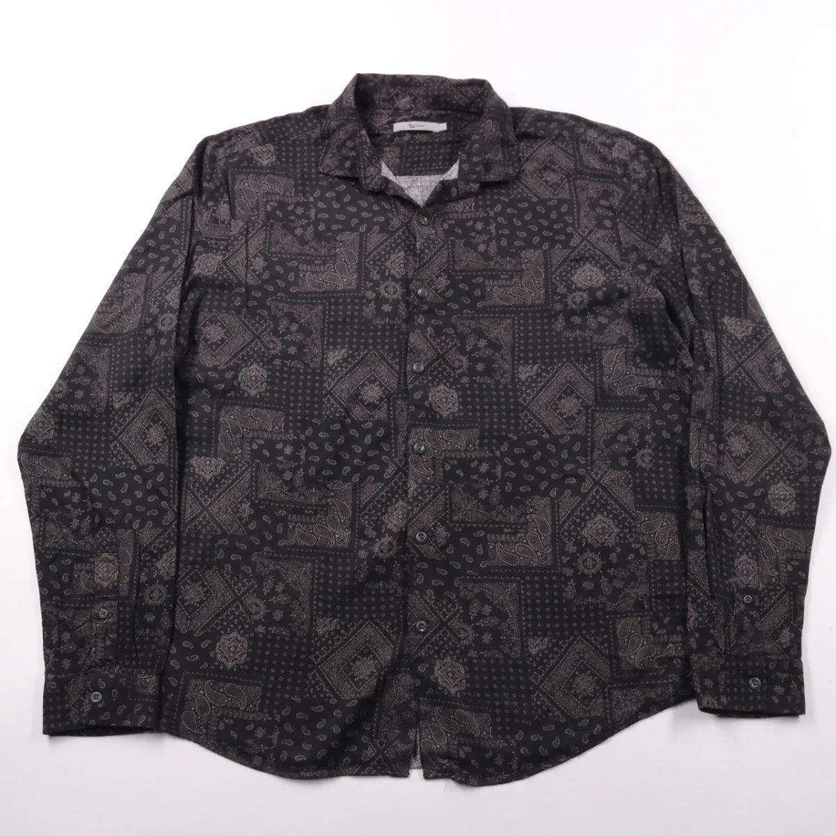 Мужская рубашка Tu Man с длинным рукавом и темным принтом в стиле пэчворк. Подойдет для повседневных образов и вечера, хорошо смотрится как самостоятельно, так и вторым слоем на футболку. Вискоза приятна к телу и дает легкую посадку без лишней жесткости.
