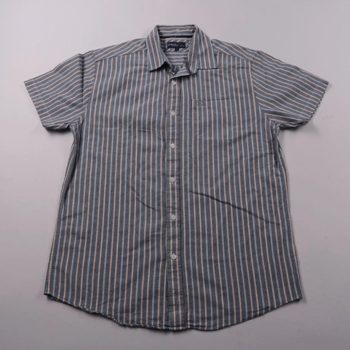 Мужская рубашка Easy Classic в серо-синюю полоску, с коротким рукавом и отложным воротником. Подойдёт для повседневной носки летом и в тёплую погоду, хорошо смотрится с джинсами или чиносами. Натуральный хлопок приятен к телу и нормально дышит в жару.
