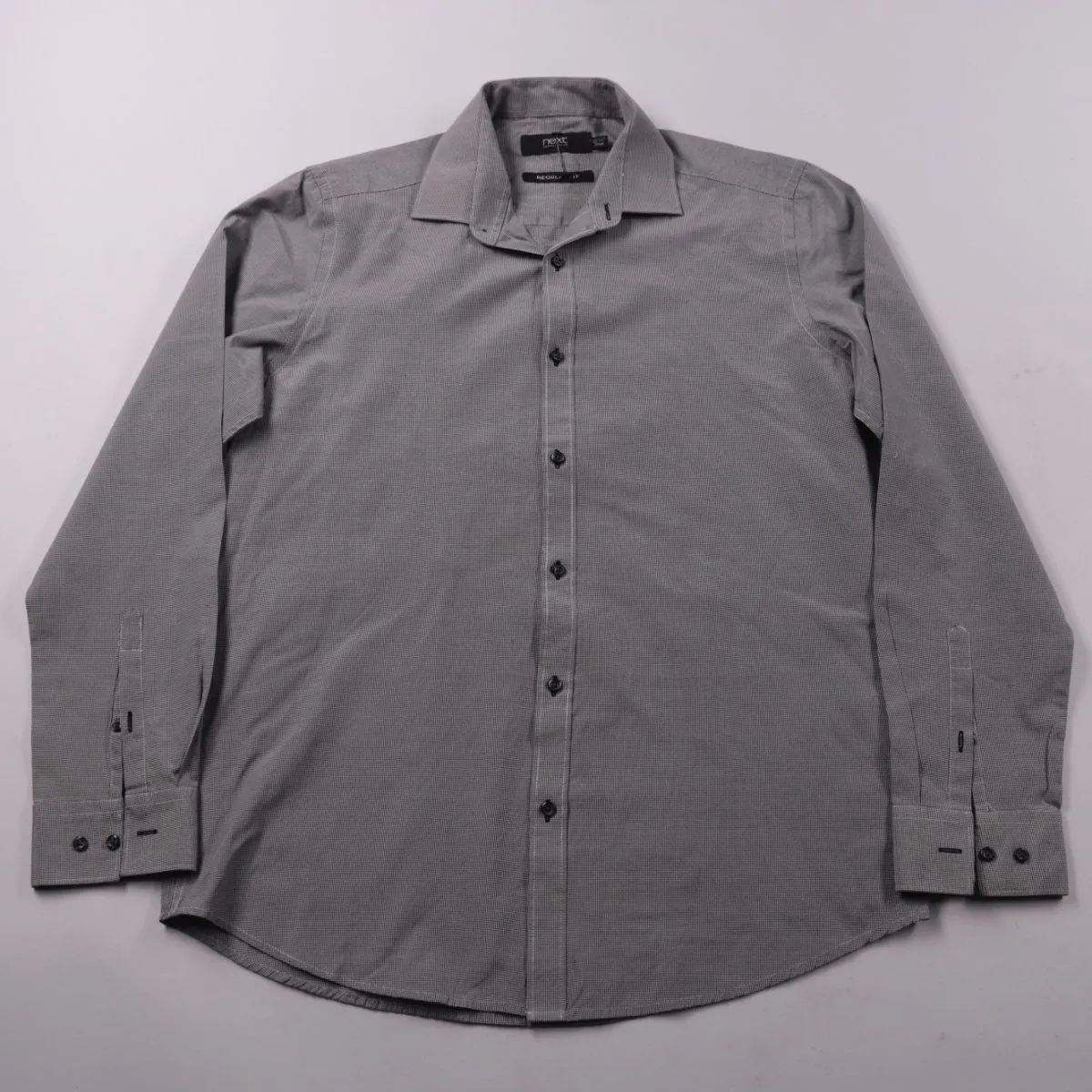 Мужская рубашка Next Formal Wear в сером мелком принте, модель Regular Fit, с длинным рукавом и застёжкой на пуговицы. Подойдёт для офиса и более формальных выходов, легко сочетается с брюками и джинсами. Практичный плюс — нейтральный цвет и классический крой.