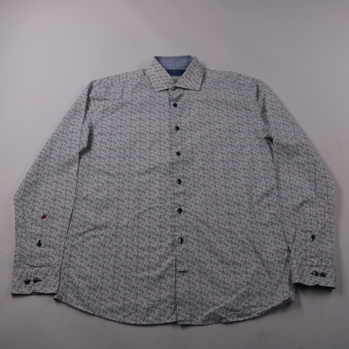 Мужская рубашка Pope с длинным рукавом и мелким принтом на светлой основе. Подойдёт для офиса и повседневных образов, хорошо смотрится с джинсами и брюками. Натуральный хлопок приятен к телу и комфортен в носке.