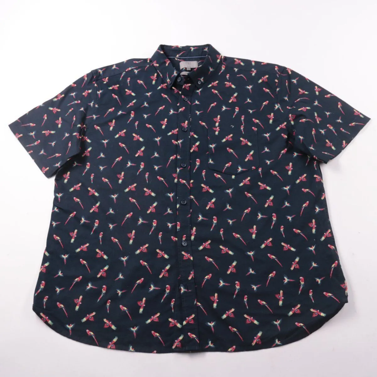 Мужская рубашка M&S Collection Slim с коротким рукавом и принтом с попугаями, с нагрудным карманом и воротником на пуговицах. Подойдёт для лета и повседневных образов. Хлопковая ткань хорошо дышит и комфортна в носке.