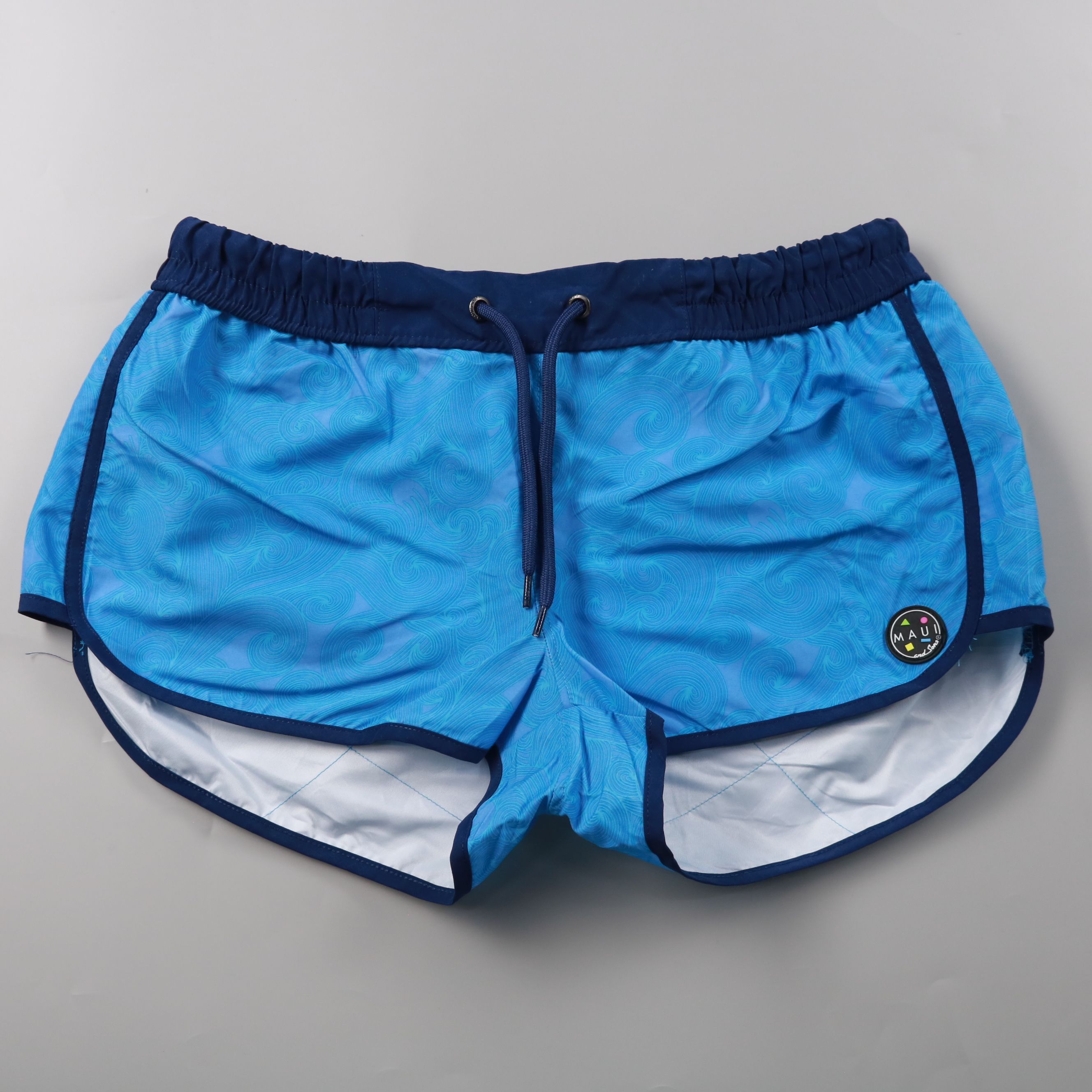 Мужские шорты Maui and Sons (Original Boardwear) в голубом цвете с тёмно-синим поясом на шнурке и принтом. Подойдут для пляжа, бассейна и отдыха в жаркую погоду. Лёгкий полиэстер быстро сохнет и не утяжеляет при намокании.