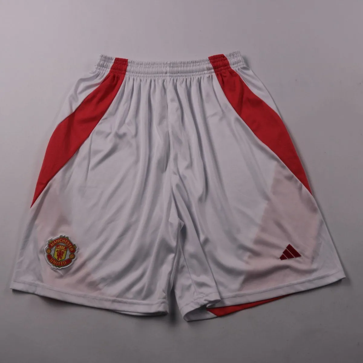Мужские спортивные шорты Adidas белого цвета с красными вставками, с эмблемой Manchester United и логотипом бренда. Подойдут для футбола, тренировок и активного отдыха в тёплую погоду. Лёгкая синтетическая ткань быстро сохнет и комфортно носится.