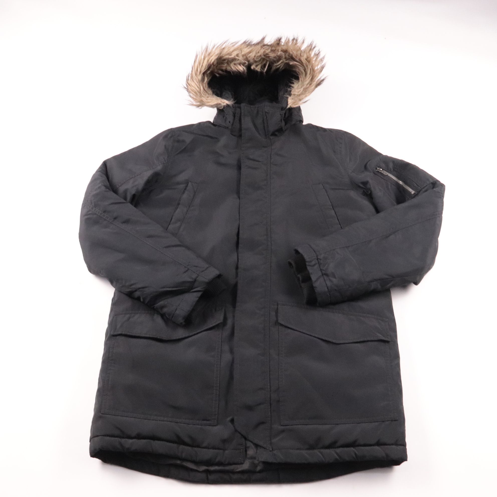 Мужская зимняя куртка H&M с капюшоном и опушкой, прямой посадки и удлинённого кроя. Подойдёт для повседневной носки в холодную погоду, есть большие накладные карманы и карман на рукаве на молнии. Плотный верх и утеплитель из полиэстера хорошо держат те...