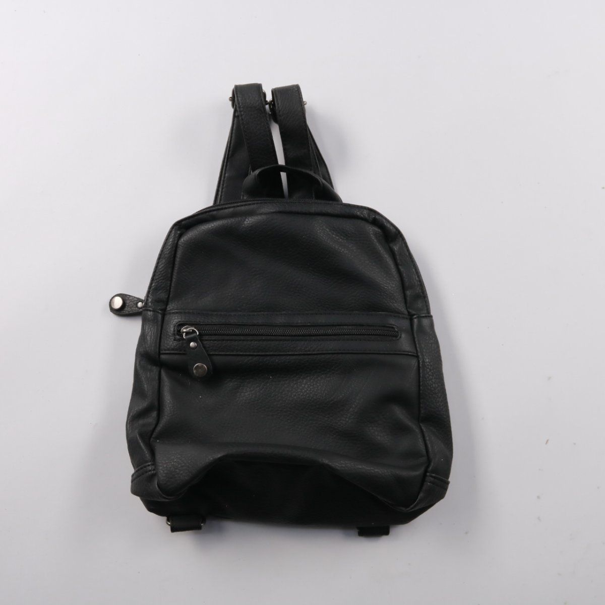 Компактный чёрный рюкзак из мягкой искусственной кожи с основным отделением на молнии и внешним карманом спереди. Подойдёт для повседневных прогулок и поездок, когда нужно взять только самое необходимое. Регулируемые лямки и несколько карманов помогают удобно распределить мелочи.