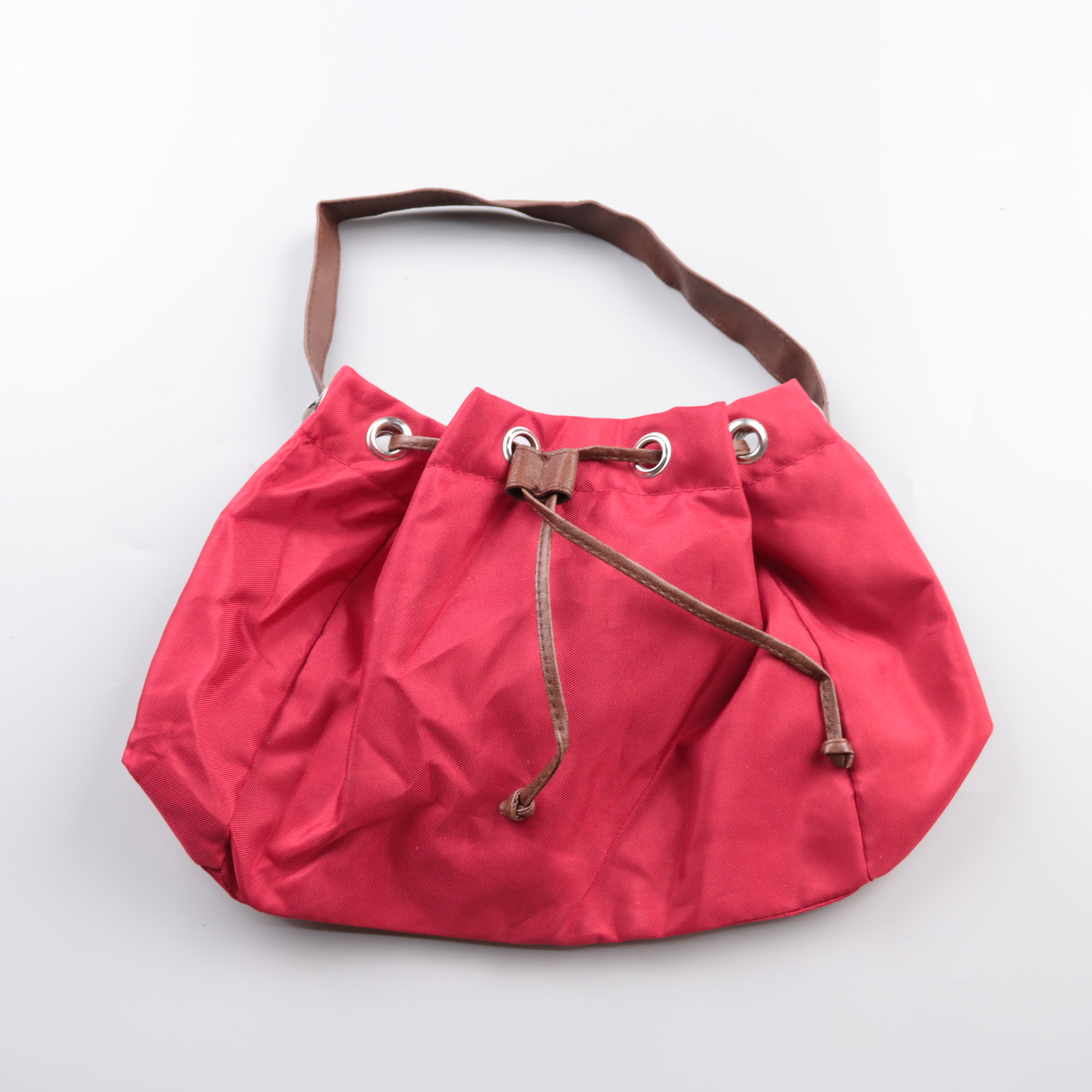 Сумка-мешок ярко-розового цвета с коричневым ремнём и кулиской на люверсах. Подойдёт для повседневных прогулок и поездок, когда нужно взять с собой самое необходимое. Лёгкий текстильный материал и удобная затяжка позволяют быстро закрывать сумку и держ...