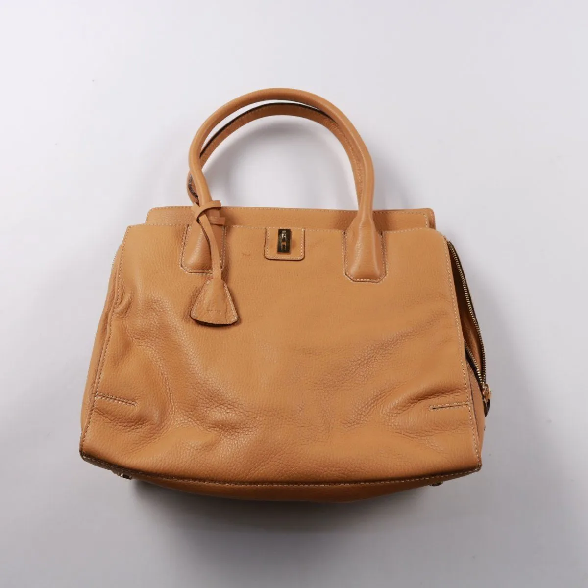 Женская сумка Tous из фактурной кожи в рыжем (карамельном) оттенке, с короткими ручками и боковыми молниями. Подойдёт для города и работы: помещает ежедневные вещи и документы. Практичный плюс — удобная форма и устойчивое дно, сумка хорошо держится в руках.