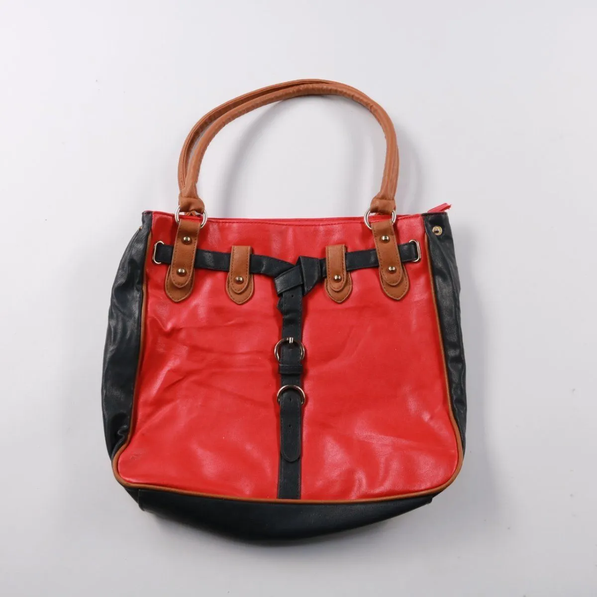 Женская сумка с ручками в красно‑чёрной гамме, с декоративными ремешками и металлической фурнитурой. Подойдёт для повседневных выходов и городских образов, внутри одно основное отделение с карманами. Удобно носить в руке или на предплечье благодаря плотным ручкам.