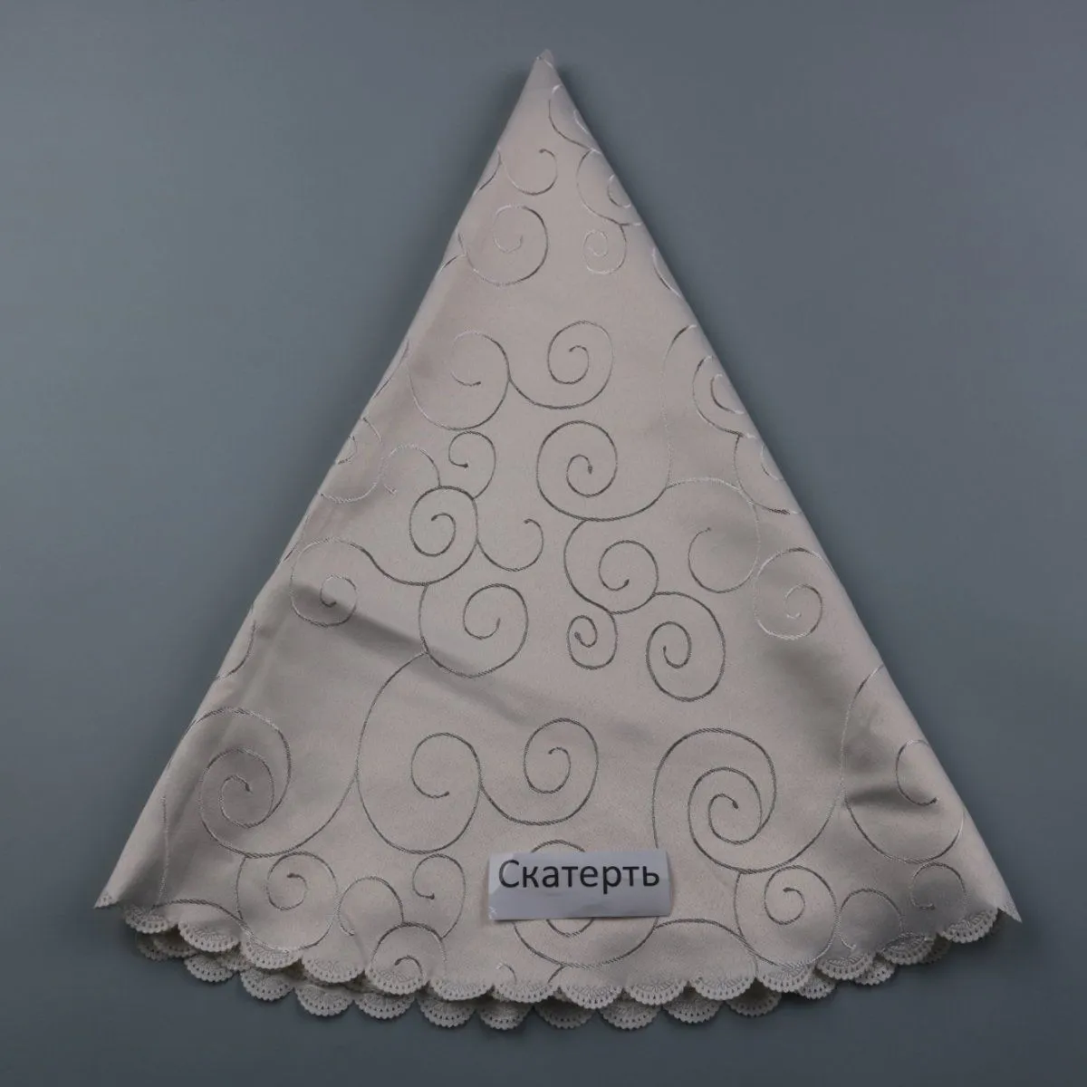 Скатерть светлого цвета с узором из завитков и фигурным кружевным краем. Подойдёт для сервировки кухонного или праздничного стола и аккуратно смотрится в классическом интерьере. Легко складывается и не занимает много места при хранении.