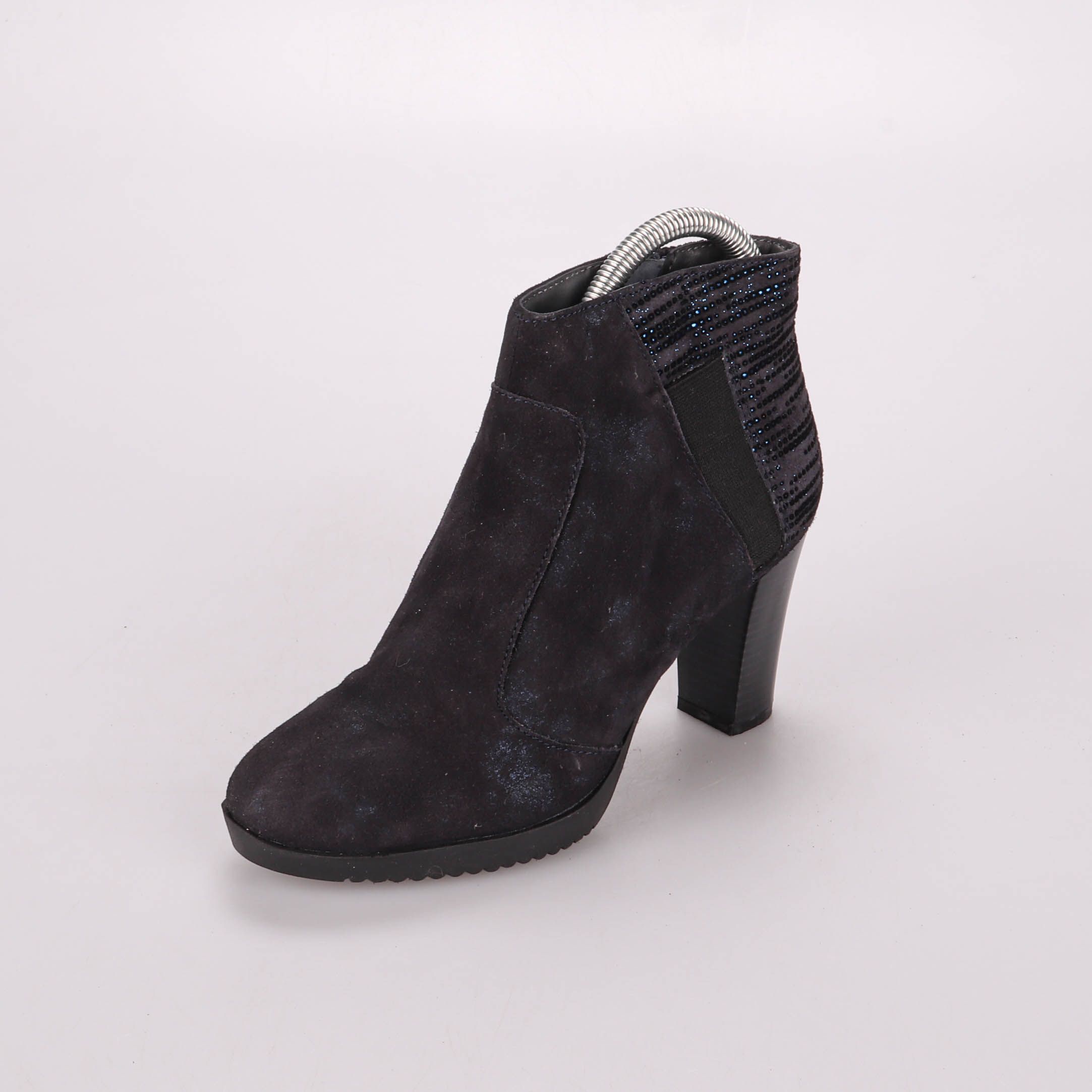 Женские ботильоны из тёмной замши с боковой молнией и декоративной отделкой стразами сзади. Подойдут для повседневных и вечерних образов в демисезон, устойчивый каблук делает ходьбу комфортнее. Рифлёная подошва помогает уменьшить скольжение на улице.