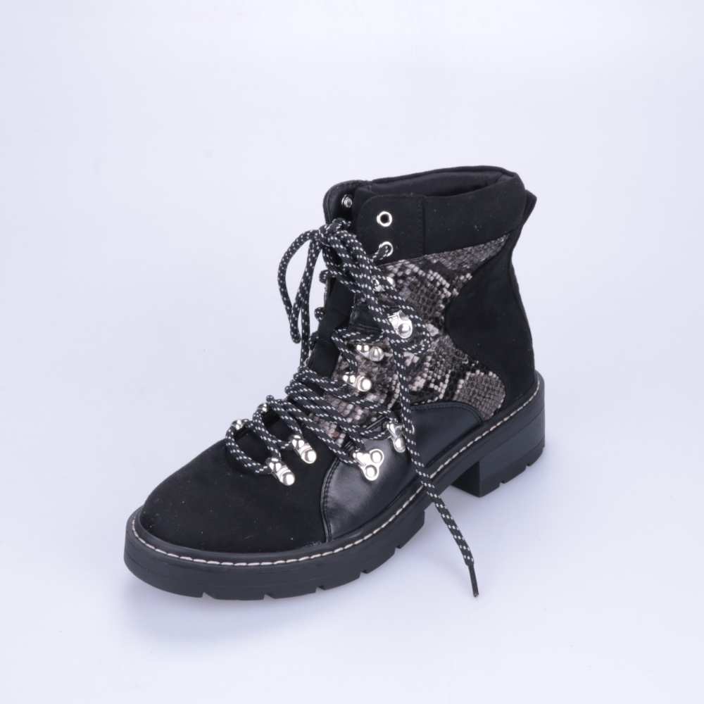Женские ботинки на шнуровке в чёрном цвете с вставками под змеиную кожу и металлической фурнитурой. Подойдут на каждый день в демисезон, хорошо сочетаются с джинсами и пальто. Рельефная подошва даёт устойчивость и лучшее сцепление на улице.