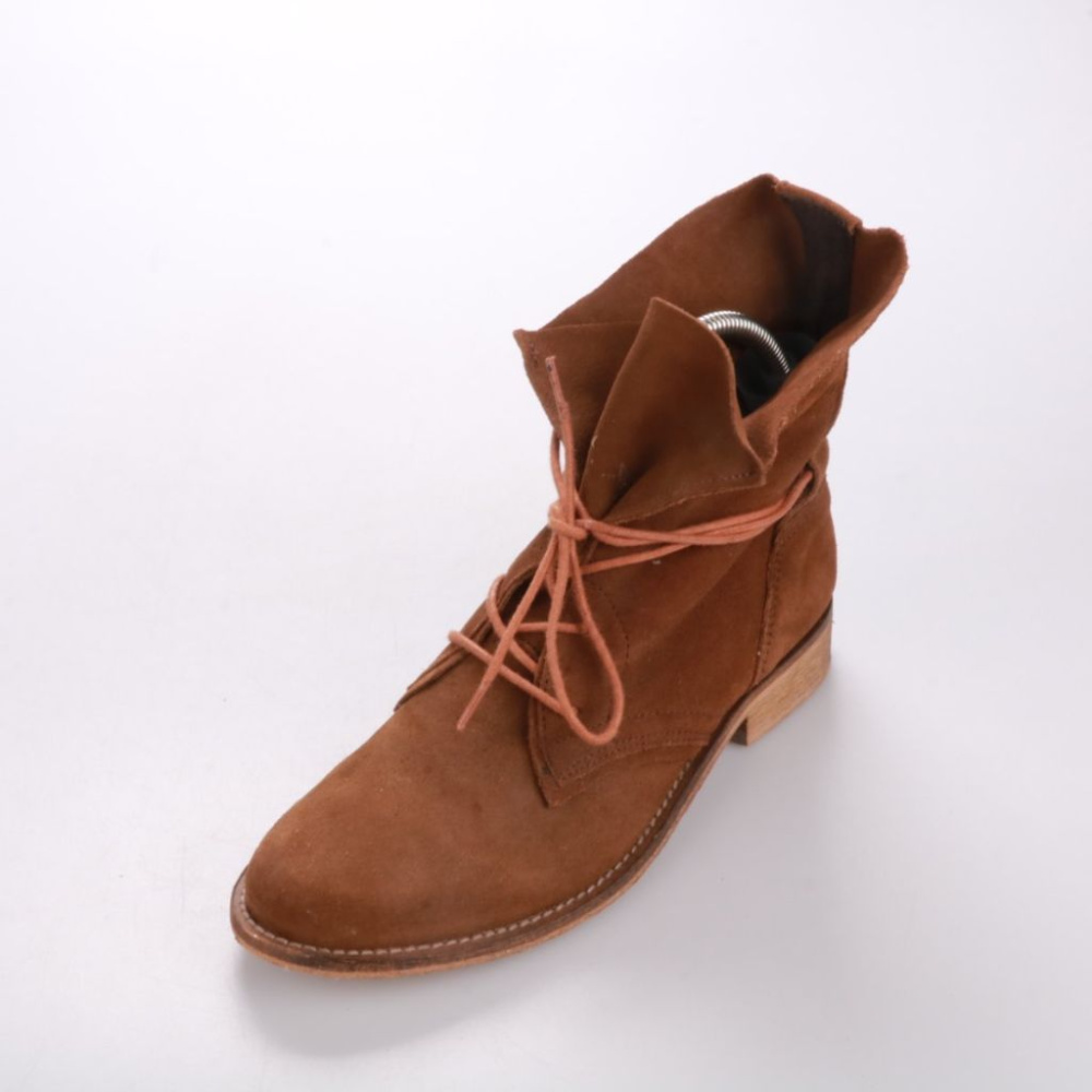 Женские замшевые ботинки в рыжем (коньячном) оттенке с мягким высоким голенищем и шнуровкой. Подойдут для повседневной носки в демисезон — с джинсами, юбками и платьями. Устойчивый невысокий каблук делает пару удобной для прогулок.