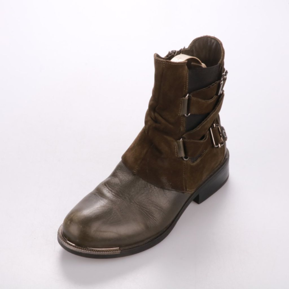 Женские ботинки без указанного бренда, комбинированные: гладкая кожа и замша, с декоративными ремешками и боковой молнией. Подойдут на каждый день в демисезон под джинсы и брюки, устойчивый низкий каблук удобен для длительной ходьбы.