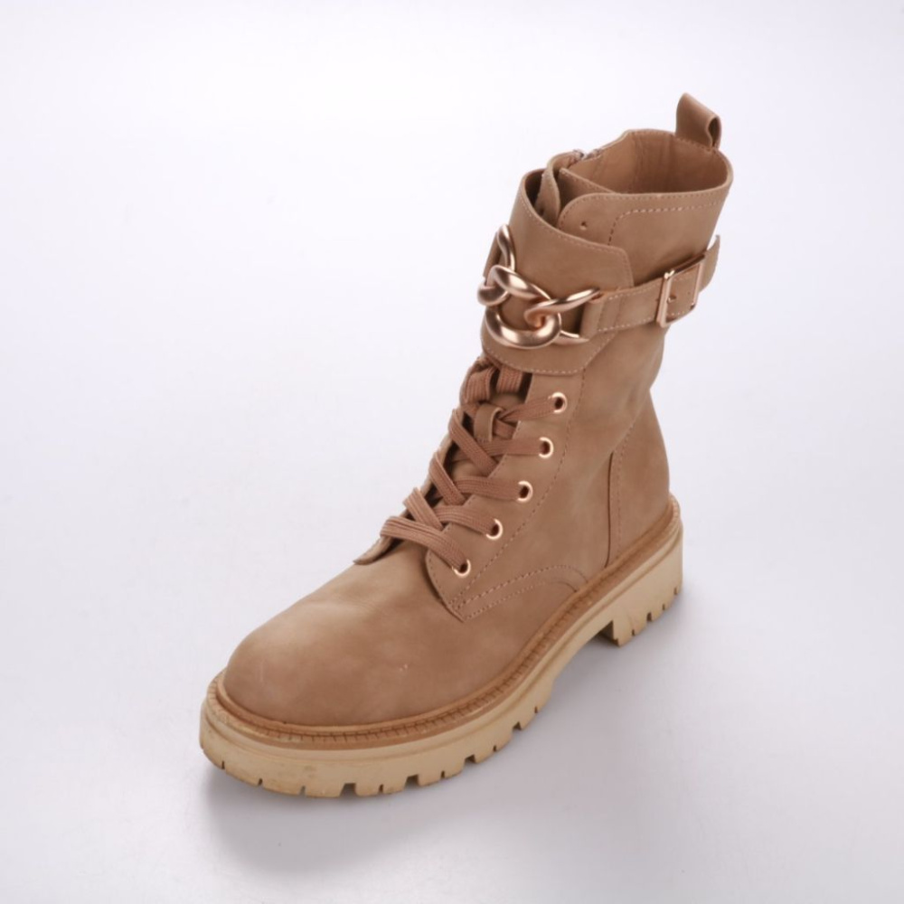 Женские демисезонные ботинки в бежевом цвете с высокой шнуровкой, боковой молнией и декоративной цепью на ремешке. Подойдут для повседневной носки и городских прогулок в прохладную погоду, хорошо сочетаются с джинсами и платьями. Практичное преимуществ...