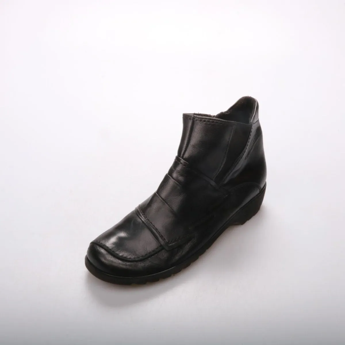 Женские кожаные ботинки Ara в чёрном цвете, с боковой молнией и удобной посадкой по щиколотке. Подойдут для повседневной носки в межсезонье, хорошо сочетаются с джинсами и брюками. Практичная рифлёная подошва даёт устойчивость на мокром асфальте и делает ходьбу комфортнее.