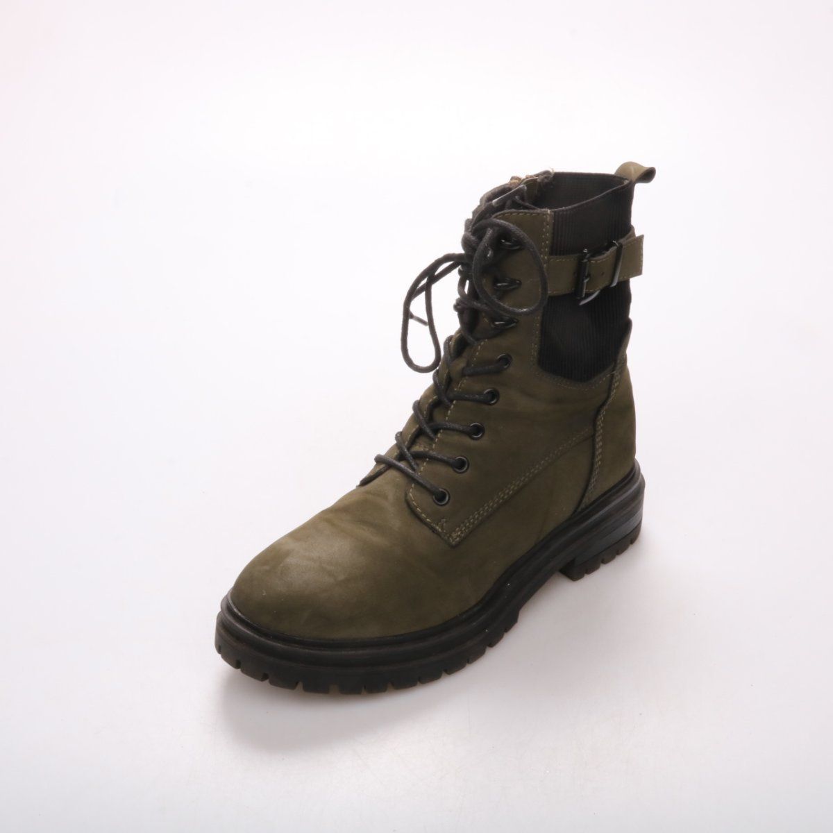 Женские ботинки на шнуровке в стиле милитари, цвет хаки, бренд не указан. Подойдут для повседневной носки в прохладную погоду и на прогулки благодаря устойчивой массивной подошве. Удобная боковая молния позволяет быстро обувать и снимать.