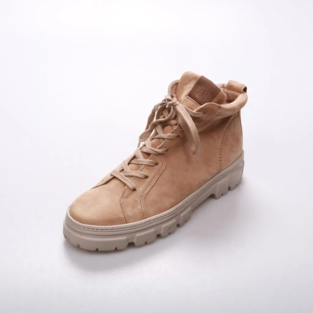 Бежевые ботинки на шнуровке с высокой мягкой посадкой и толстой рифлёной подошвой. Подойдут для прогулок и повседневной носки в прохладную погоду. Практичный плюс — цепкая тракторная подошва даёт устойчивость на мокром асфальте.