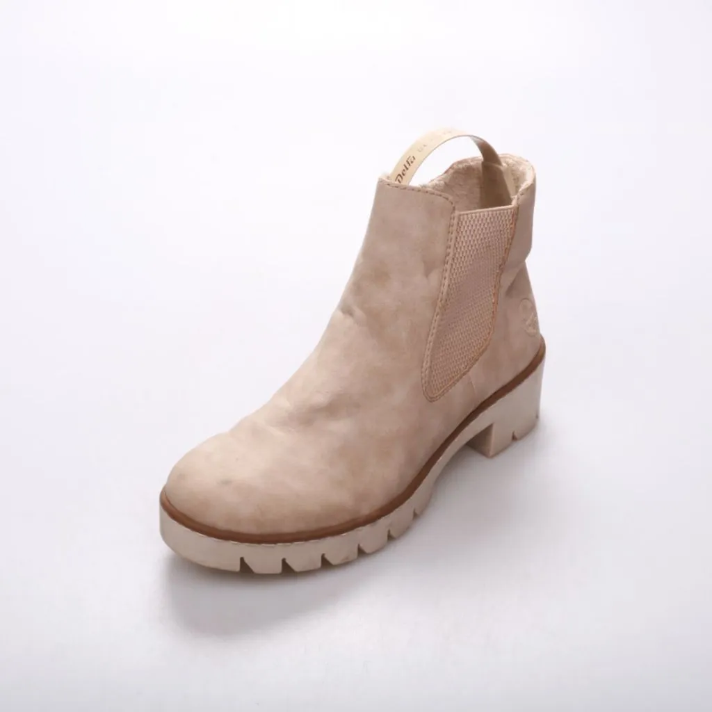 Женские ботинки Rieker из светлой замши с боковой молнией и эластичной вставкой. Подойдут для повседневной носки в городе в демисезон. Рельефная подошва даёт устойчивость и лучшее сцепление на мокрой поверхности.