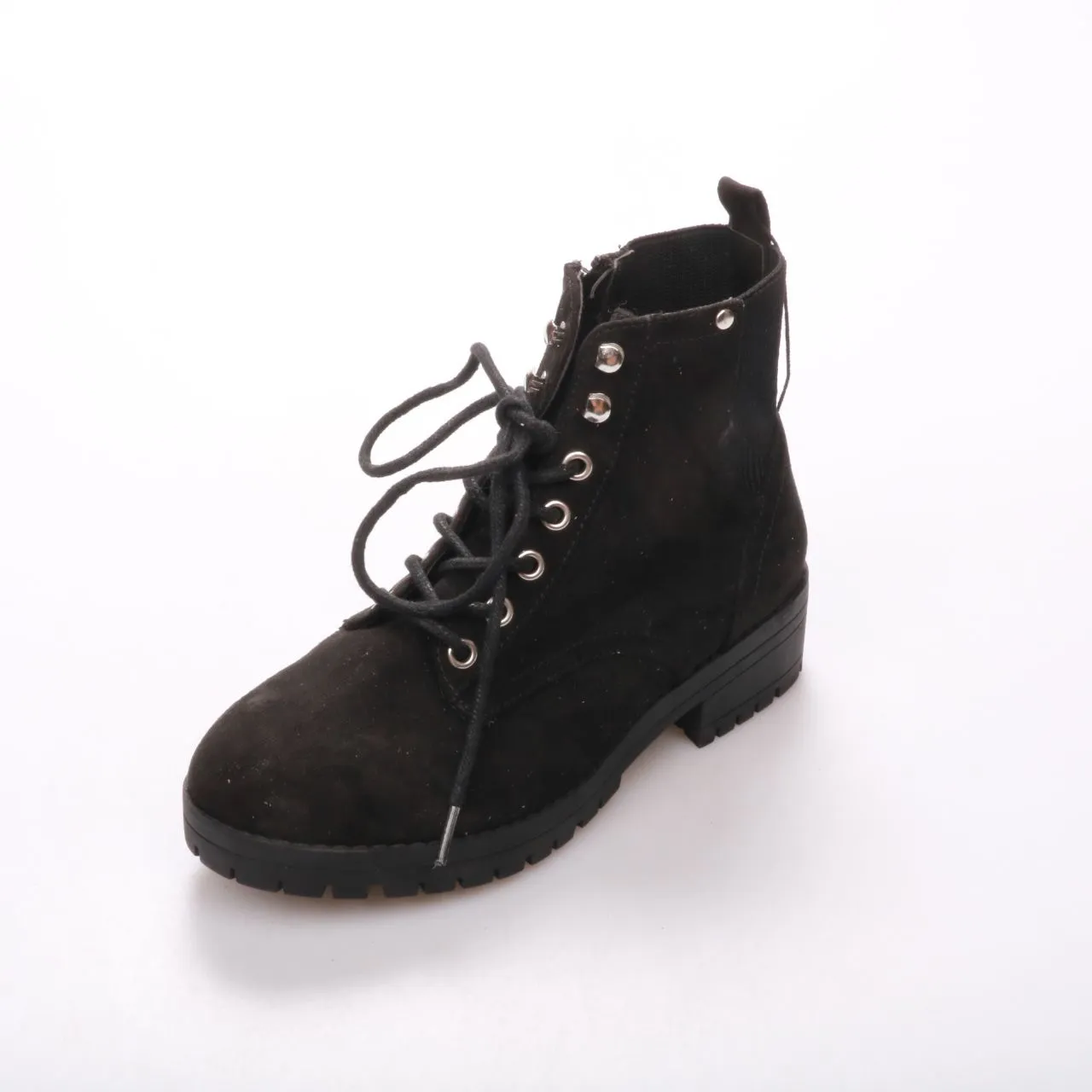 Ботинки New Look из чёрной искусственной замши на шнуровке, с боковой молнией и рифлёной подошвой. Подойдут на каждый день в демисезон, хорошо сочетаются с джинсами и платьями. Молния сбоку упрощает надевание и снятие.
