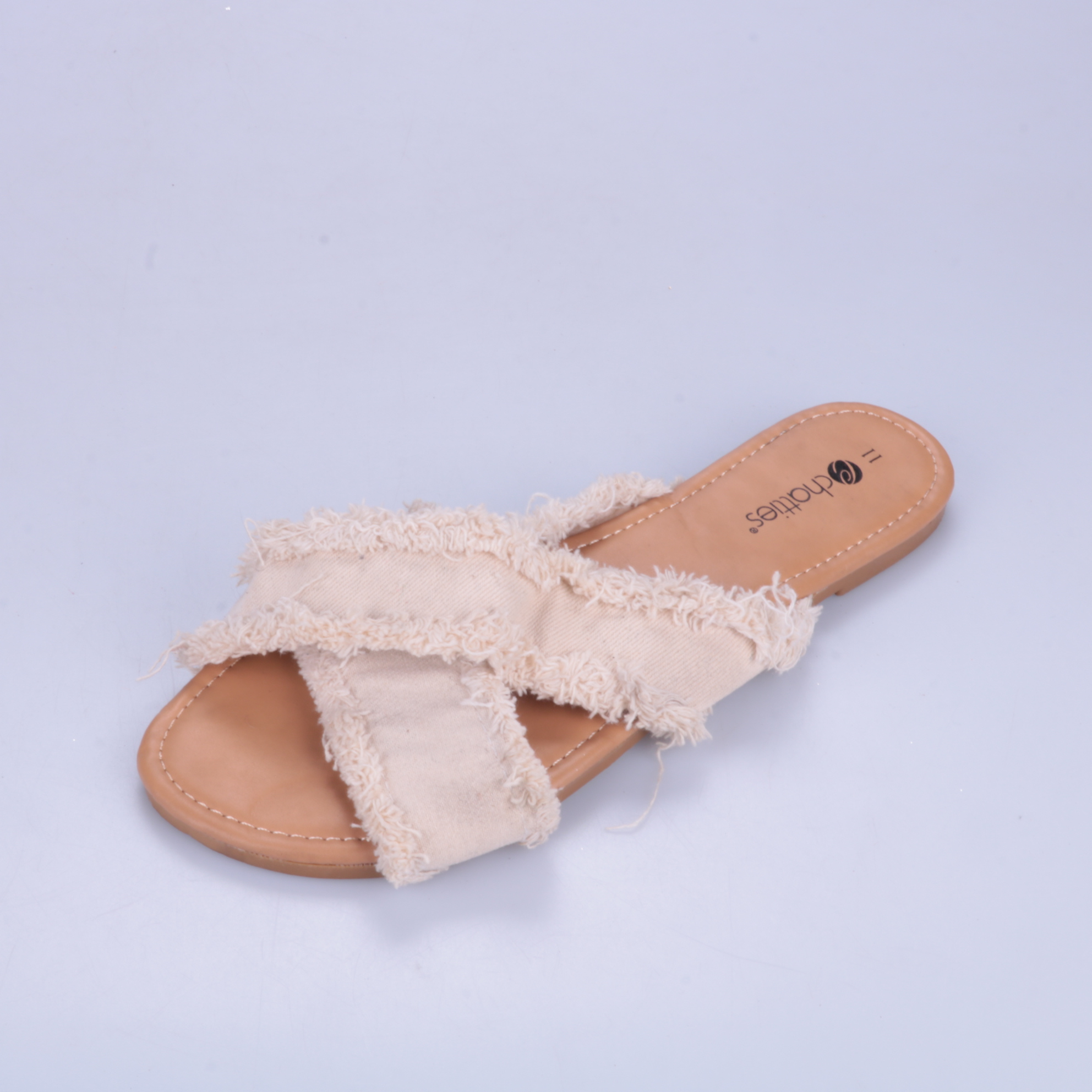 Женские сандалии Chatties в бежевом цвете с перекрёстными текстильными ремешками и бахромой по краям. Подойдут для летних прогулок и отдыха, легко сочетаются с платьями, шортами и джинсами. Открытый нос и плоская подошва дают комфорт в жару и удобство ...