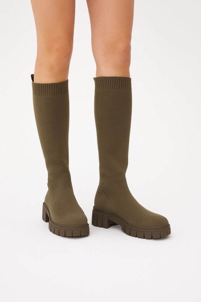 Женские сапоги-«носок» в оттенке хаки с фактурным верхом и массивной тракторной подошвой. Подойдут для демисезона и повседневных образов с джинсами или платьями. Рельефная подошва даёт устойчивость и лучшее сцепление на мокром асфальте.