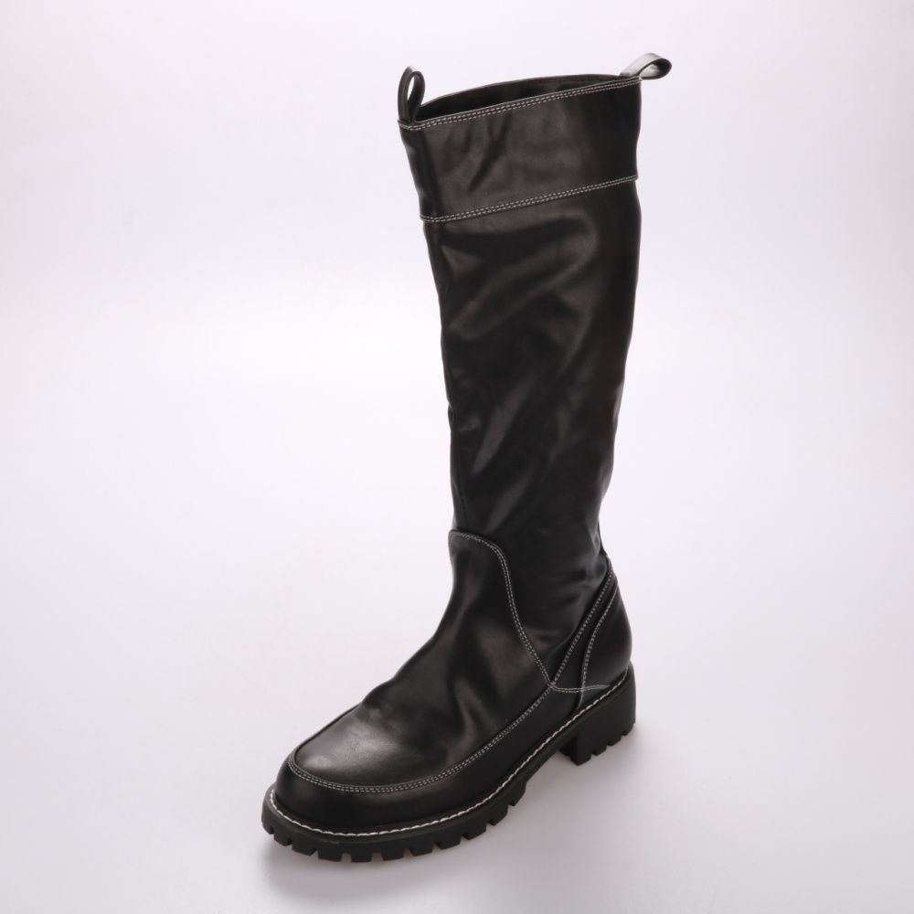 Чёрные высокие сапоги без молнии на массивной тракторной подошве, с контрастной светлой отстрочкой. Подойдут для города в прохладную погоду и легко сочетаются с джинсами, платьями и пальто. Рельефная подошва даёт хорошее сцепление и устойчивость при хо...