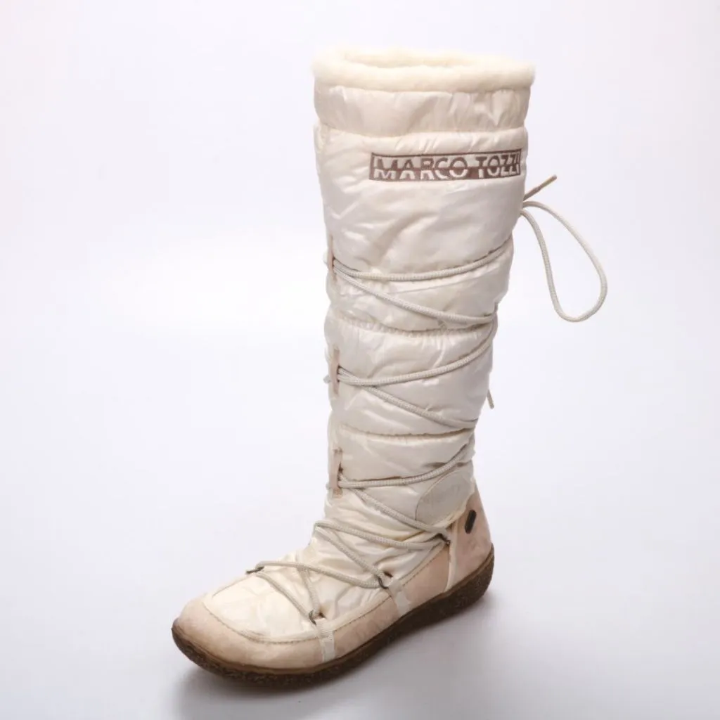 Женские зимние сапоги Marco Tozzi белого цвета, высокий стеганый верх на шнуровке. Подойдут для холодной погоды и прогулок по городу. Мягкая подкладка по верху голенища и рельефная подошва помогают сохранять тепло и устойчивость.