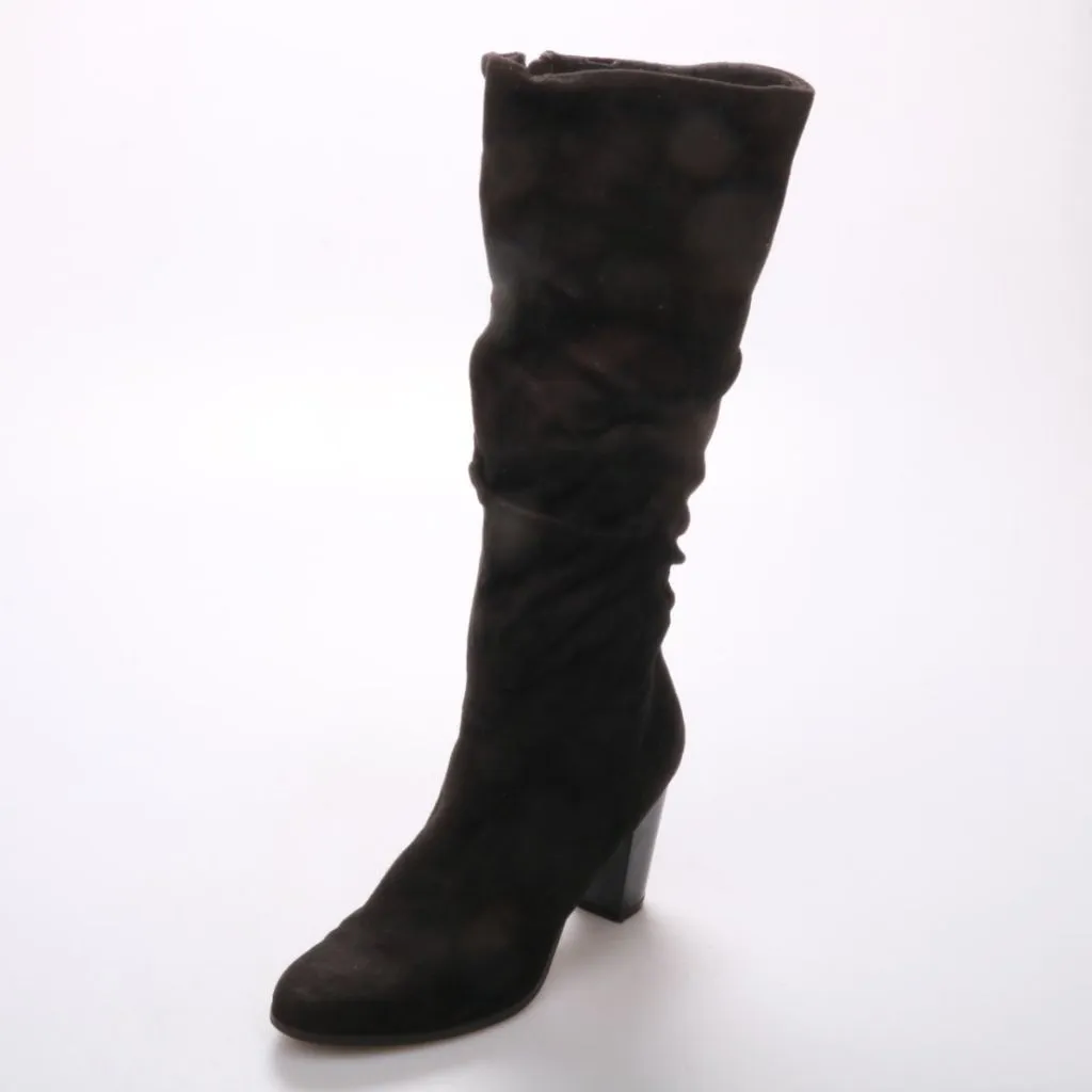 Женские сапоги Graceland из материала под замшу, чёрного цвета, с боковой молнией и устойчивым каблуком. Подойдут для повседневной носки в прохладную погоду осенью и весной. Практичный плюс — каблук удобнее в ходьбе, чем тонкая шпилька.