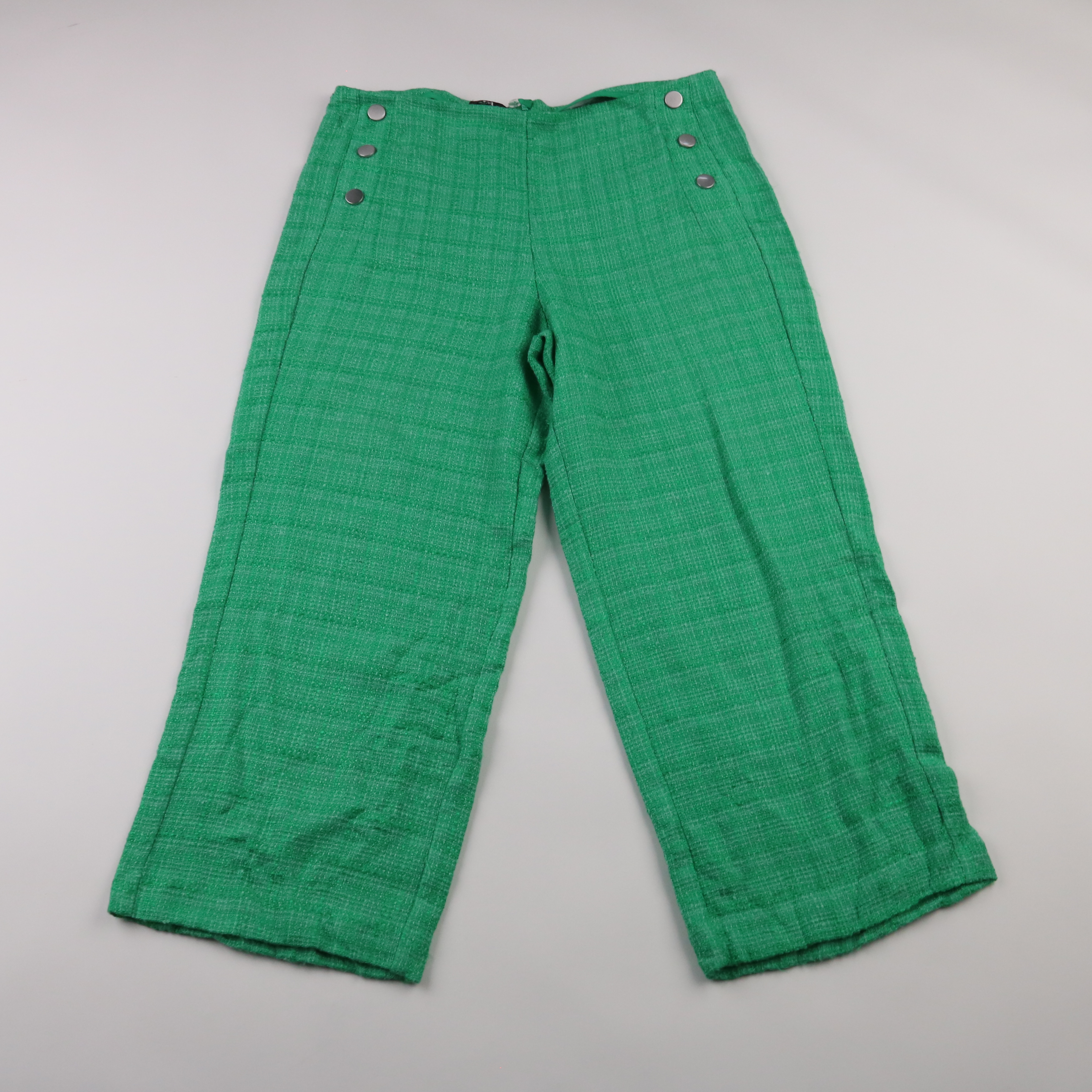 Зелёные брюки C&A из плотной фактурной ткани, с декоративными пуговицами на поясе. Подойдут для повседневных образов и офиса, хорошо сочетаются с базовыми топами и жакетами. Плотный материал держит форму и комфортен в прохладную погоду.