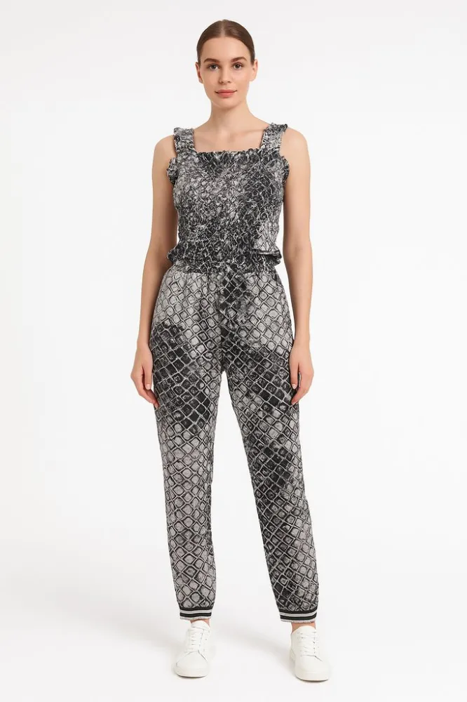 Женские брюки K-design с чёрно-белым геометрическим принтом и эластичным поясом. Подойдут для повседневных образов и поездок, легко сочетаются с однотонными топами и кедами. Практичный плюс — ткань почти не мнётся и удобно сидит за счёт резинки.