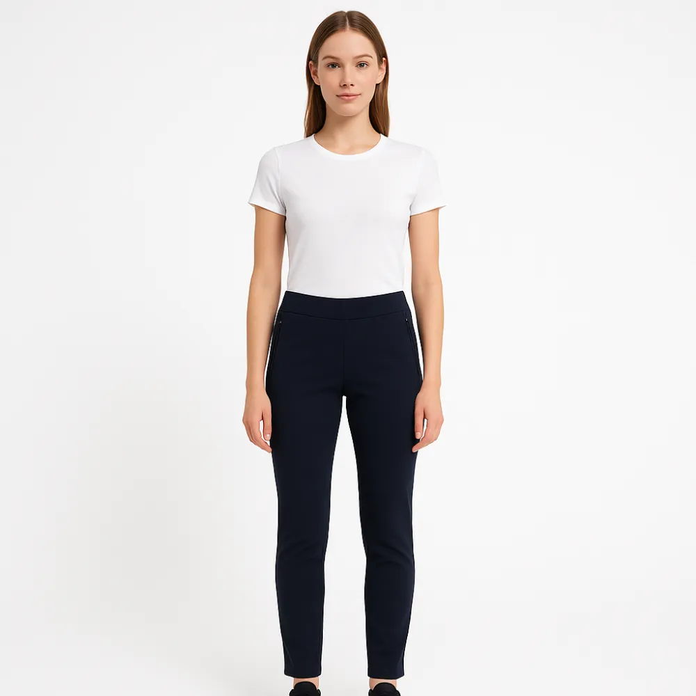 Женские брюки Zara (Trafaluc Collection) тёмно-синего цвета, прямого силуэта с высокой посадкой и боковыми карманами на молнии. Подойдут для офиса и повседневных образов с футболкой, рубашкой или жакетом. Плотная ткань держит форму и комфортно носится ...