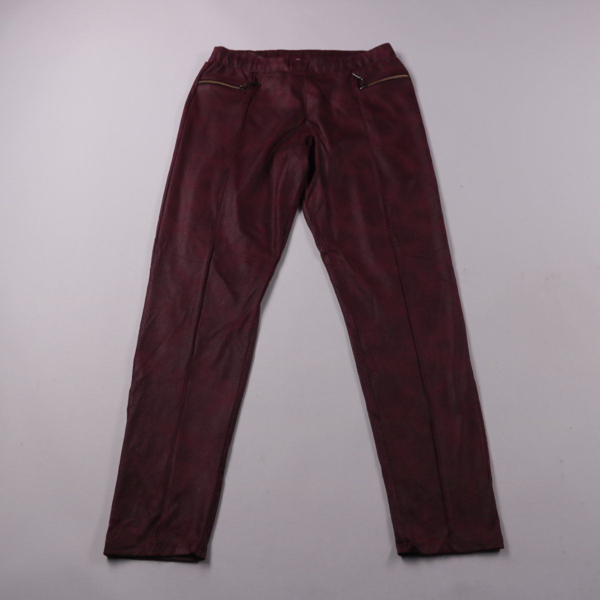 Женские брюки Kalisson в бордовом цвете с эффектом кожи и молниями на карманах. Подойдут для повседневных образов в прохладную погоду и на выход. Тянущийся материал комфортно садится по фигуре и не сковывает движения.