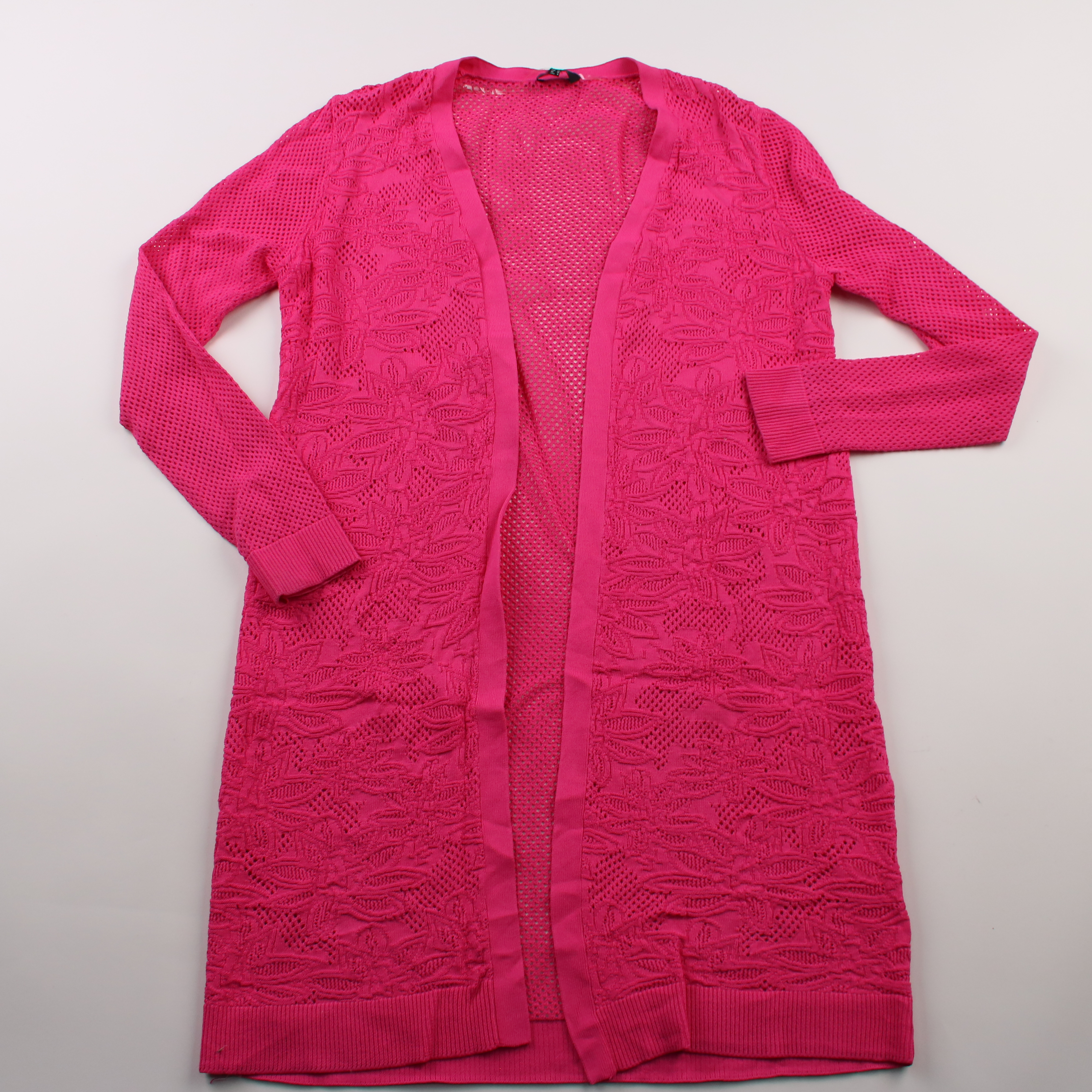 Кардиган Yest ярко-розового цвета с ажурной вязкой и открытым передом. Подойдёт для тёплой весны/лета и прохладных вечеров, хорошо смотрится поверх топа или платья. Лёгкий трикотаж «дышит» и не сковывает движения.