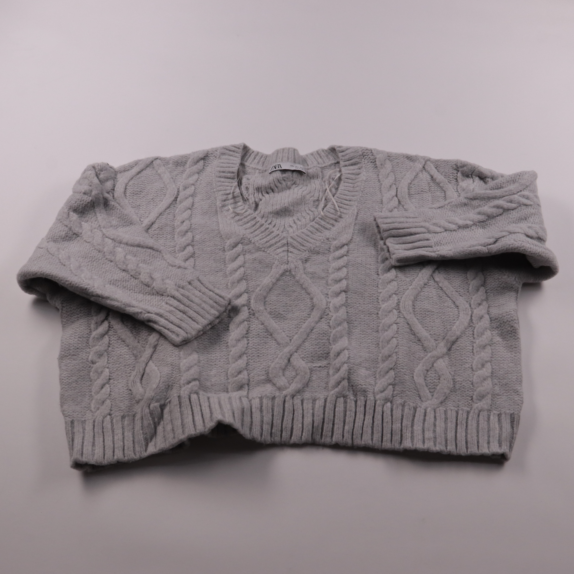 Свитер Zara крупной вязки с объёмным узором косы и V-образным вырезом. Подойдёт для прохладной погоды и многослойных повседневных образов. Мягкий и тёплый, хорошо сочетается с джинсами и юбками.