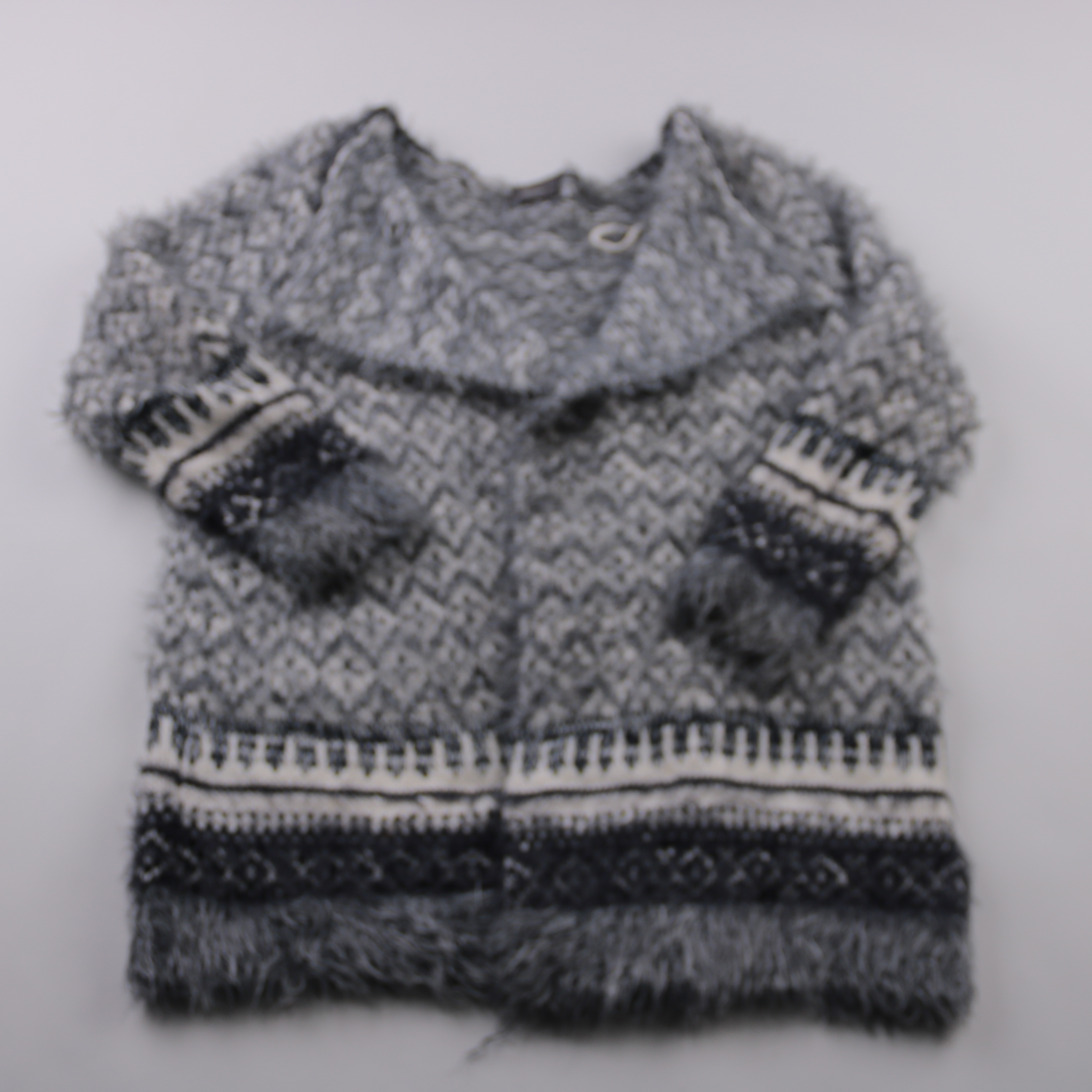 Кардиган Yessica с пушистой фактурой и чёрно-белым жаккардовым узором. Подойдёт для прохладной погоды и уютных повседневных образов с джинсами или юбкой. Материал мягкий и тёплый, легко сочетать с базовыми вещами.
