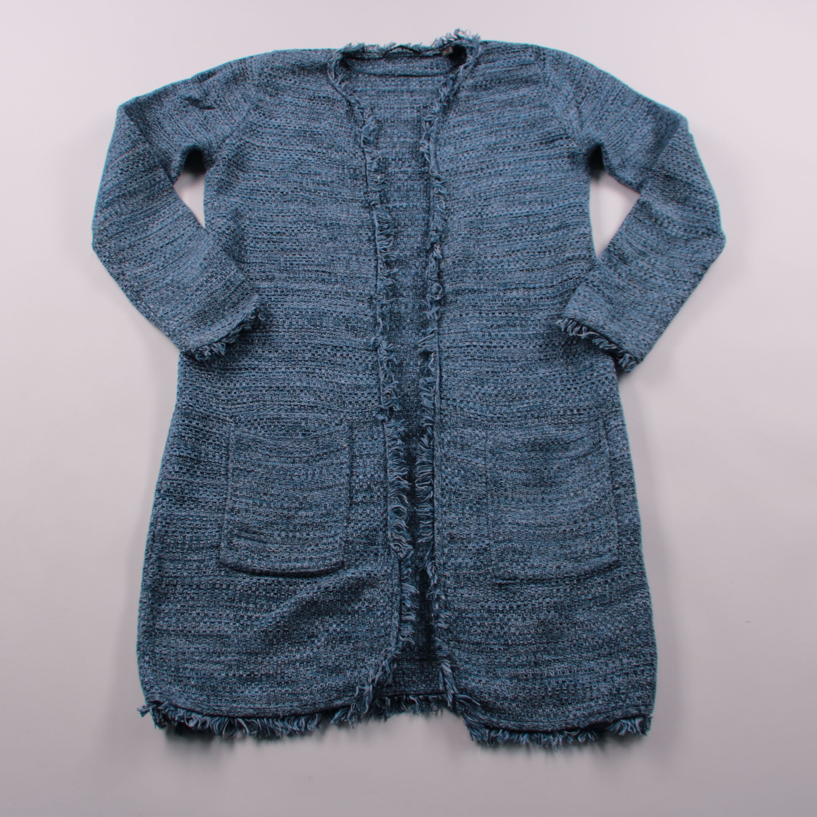 Вязаный кардиган Esprit голубого оттенка с фактурной вязкой и бахромой по краям, без застёжки, с накладными карманами. Подойдёт для повседневных образов в офис или на прогулку, удобно носить поверх топа или водолазки. Практичный плюс — мягкий трикотаж ...