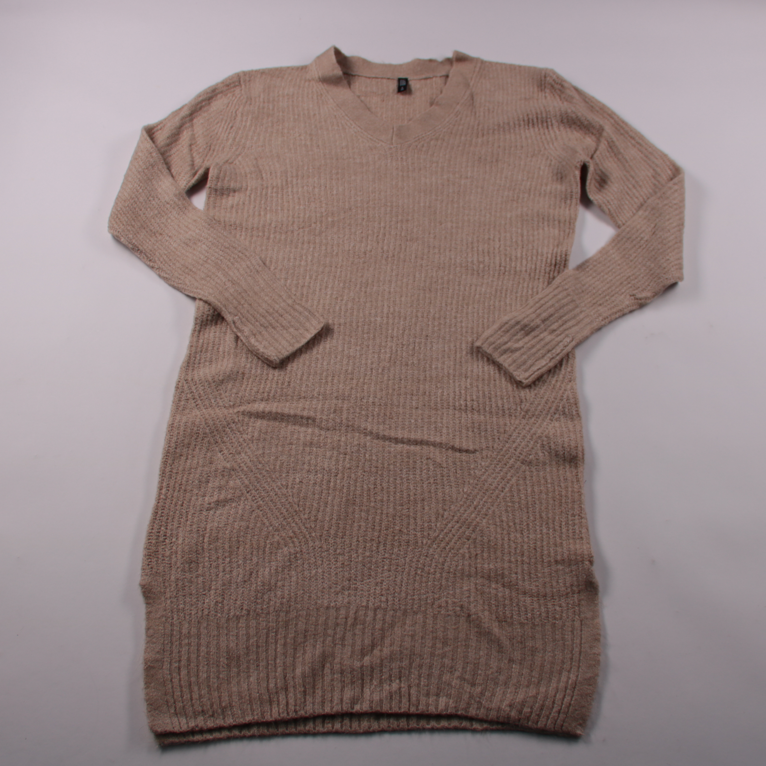 Трикотажное платье-джемпер Ladies Fashion в бежевом цвете с V-образным вырезом и длинным рукавом. Подойдёт для повседневных образов в прохладную погоду, хорошо сочетается с ботинками или кроссовками. Эластичная фактура материала комфортно садится по фи...