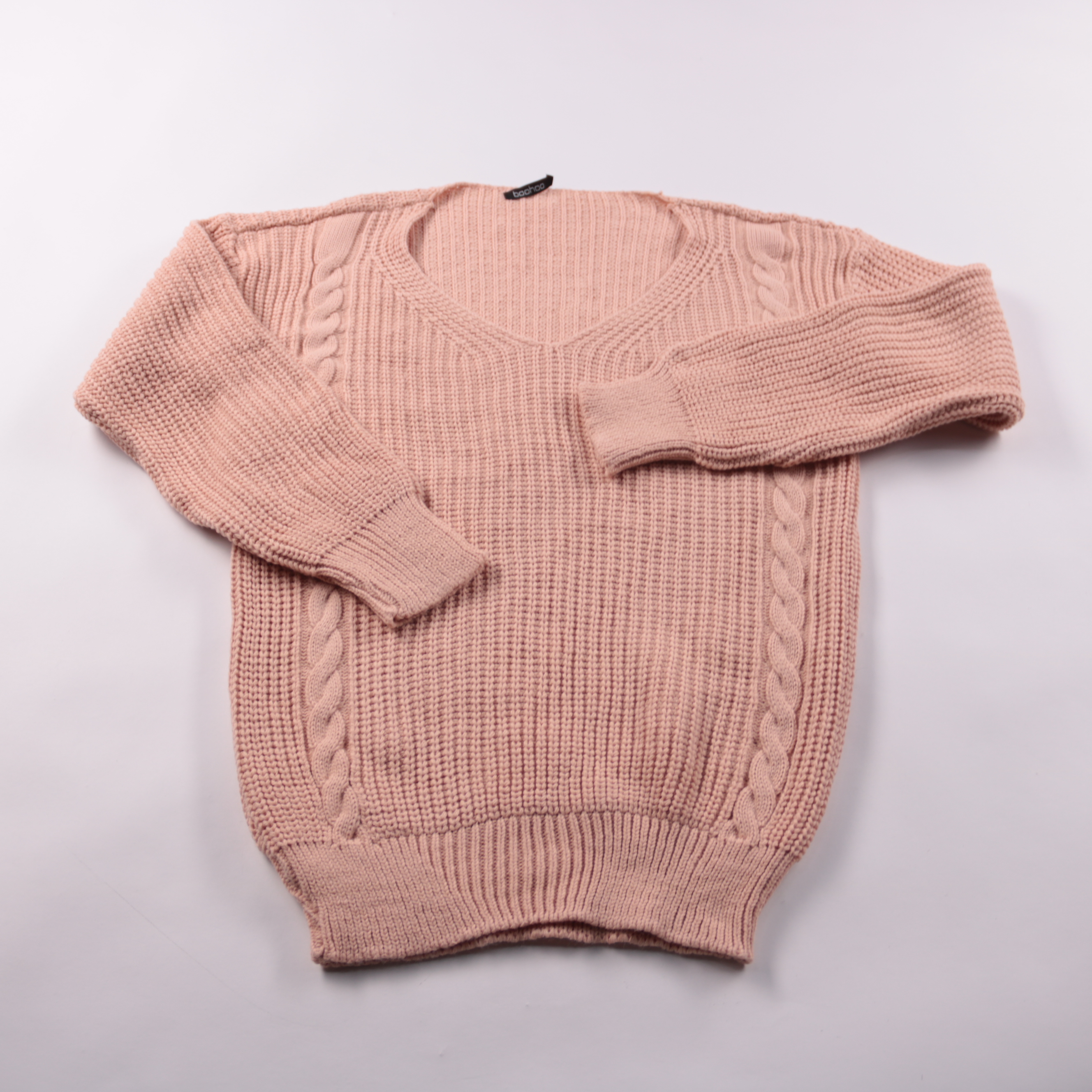 Вязаный свитер Boohoo пудрово-розового цвета с V-образным вырезом и фактурной вязкой с косами по переду. Подойдёт для повседневных образов в прохладную погоду, хорошо сочетается с джинсами и юбками. Плотный акриловый трикотаж простой в уходе и держит ф...