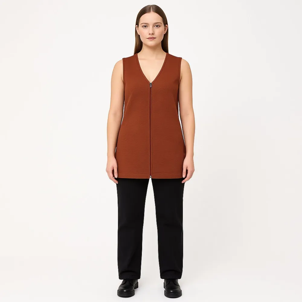 Женская кофта без рукавов на молнии из плотного трикотажа. Подойдёт для повседневных образов в прохладную погоду, удобно носить поверх топа или водолазки. Практичный плюс — материал из полиэстера прост в уходе и быстро сохнет.