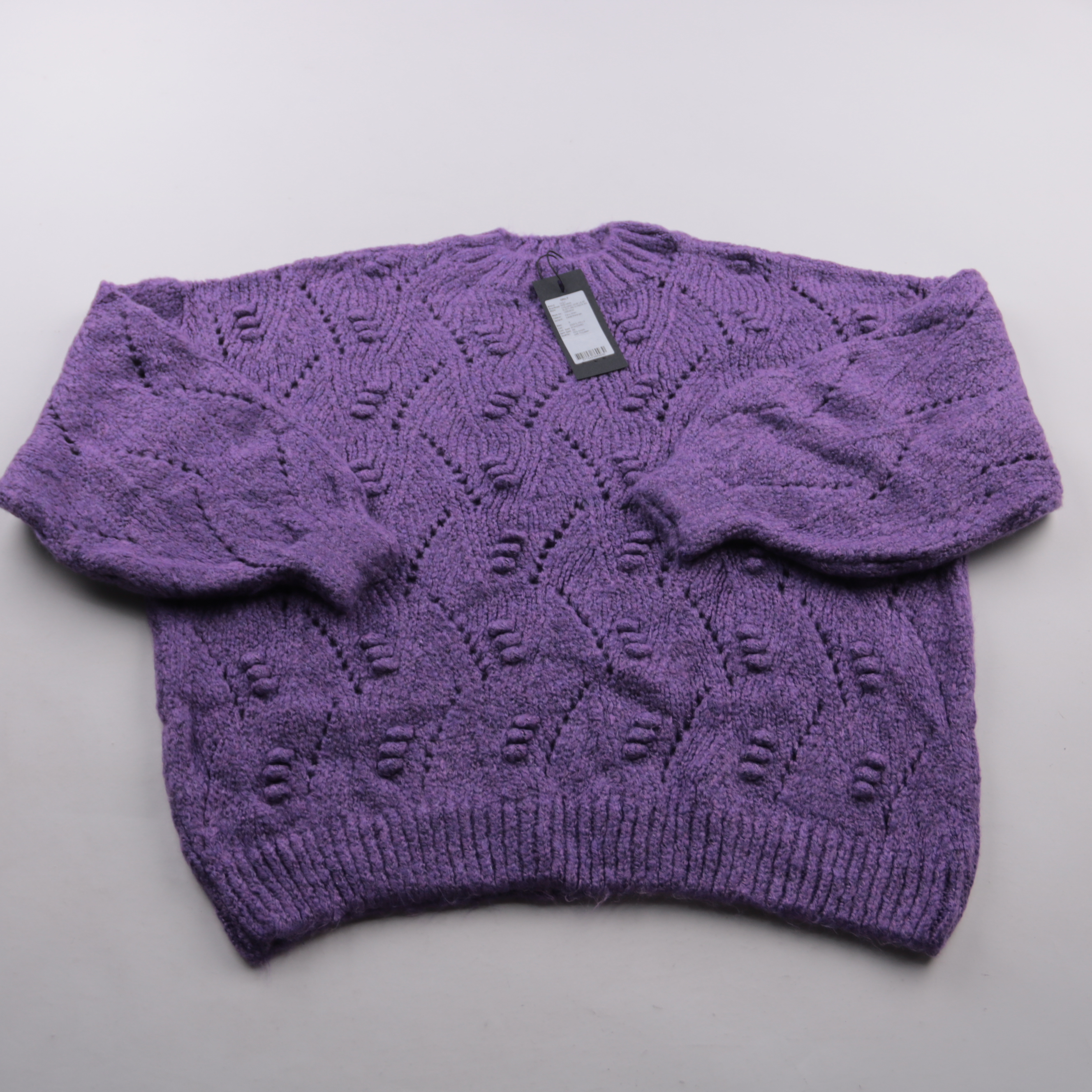 Фактурный свитер Only фиолетового меланжевого оттенка с объёмным узором и круглым вырезом. Подойдёт для прохладной погоды и уютных повседневных образов с джинсами или юбкой. Плотная вязка хорошо держит форму и согревает.